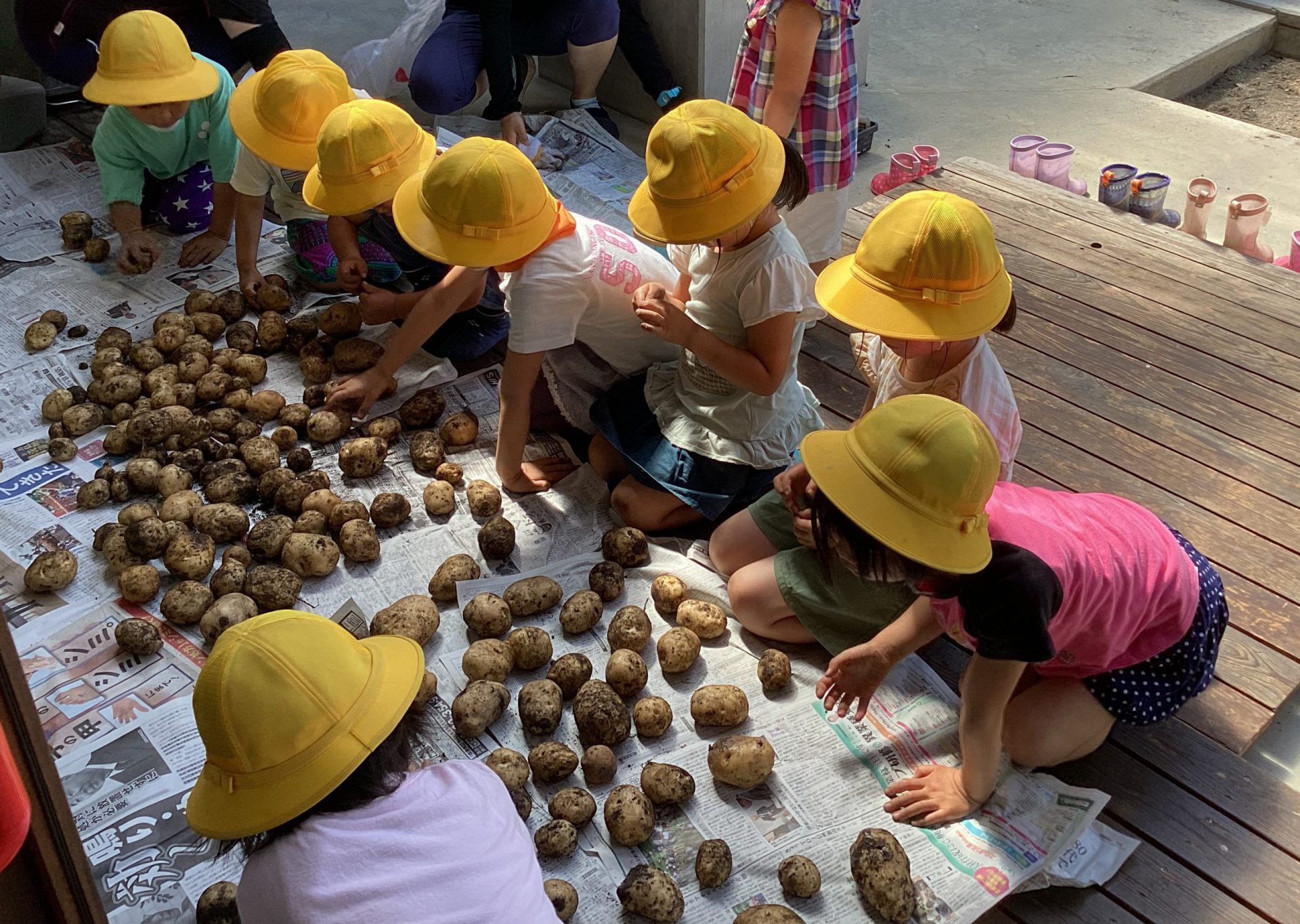 運んできたじゃがいもは、新聞紙の上に重ならないように広げ、日陰で乾かしました。