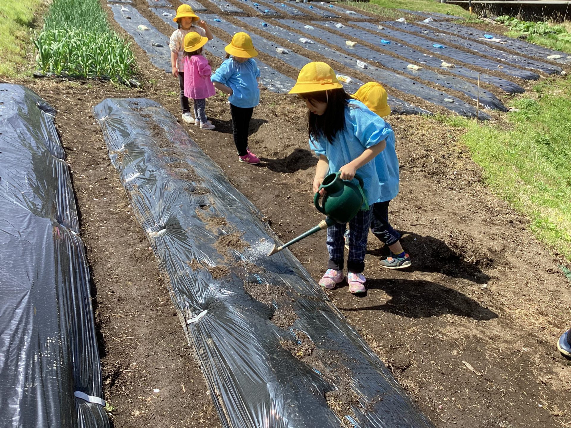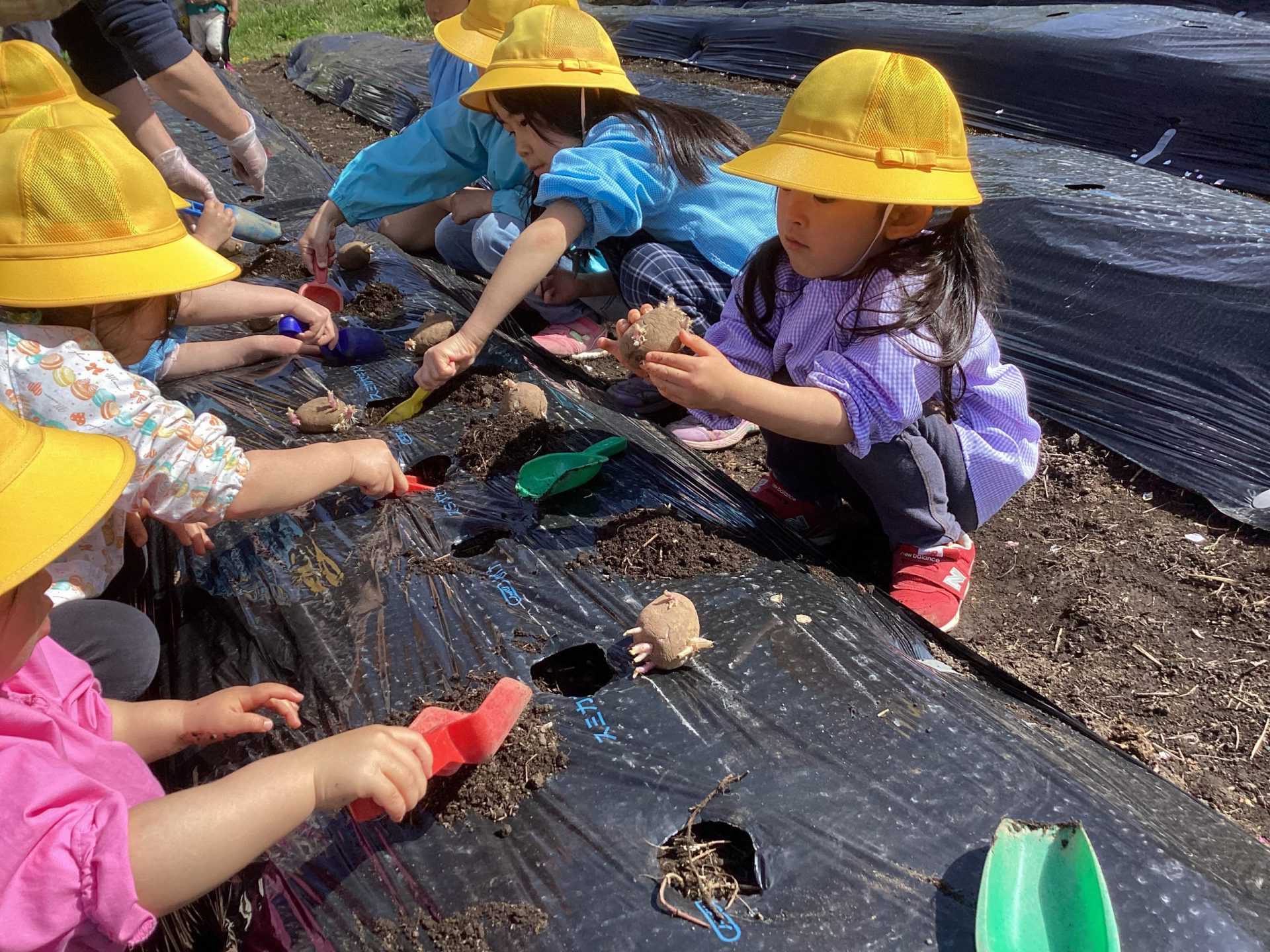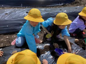 保育士から、じゃがいもの植え方を聞きます。マルチの穴に合わせて、場所に付き穴を掘って植えていきます。
