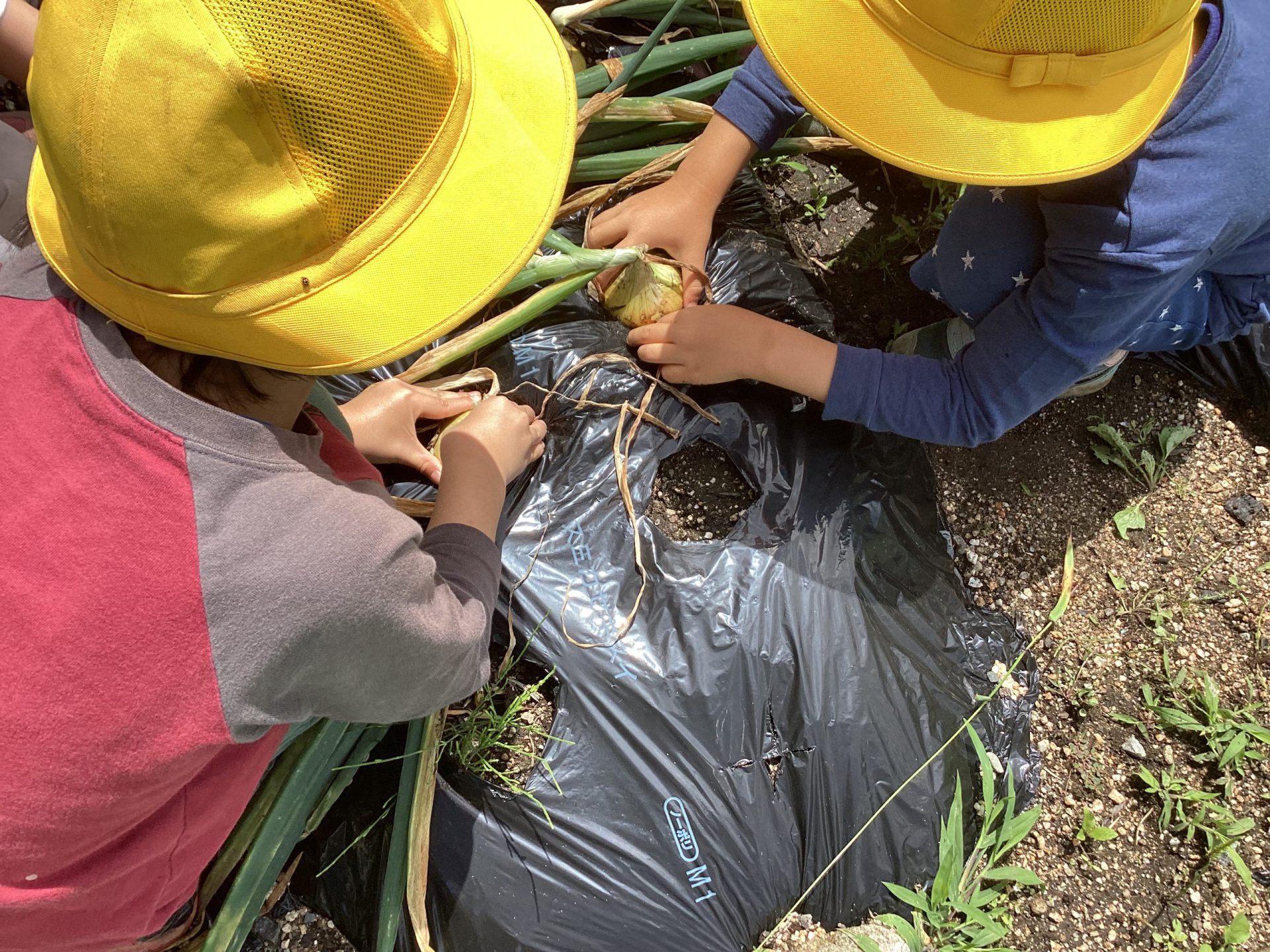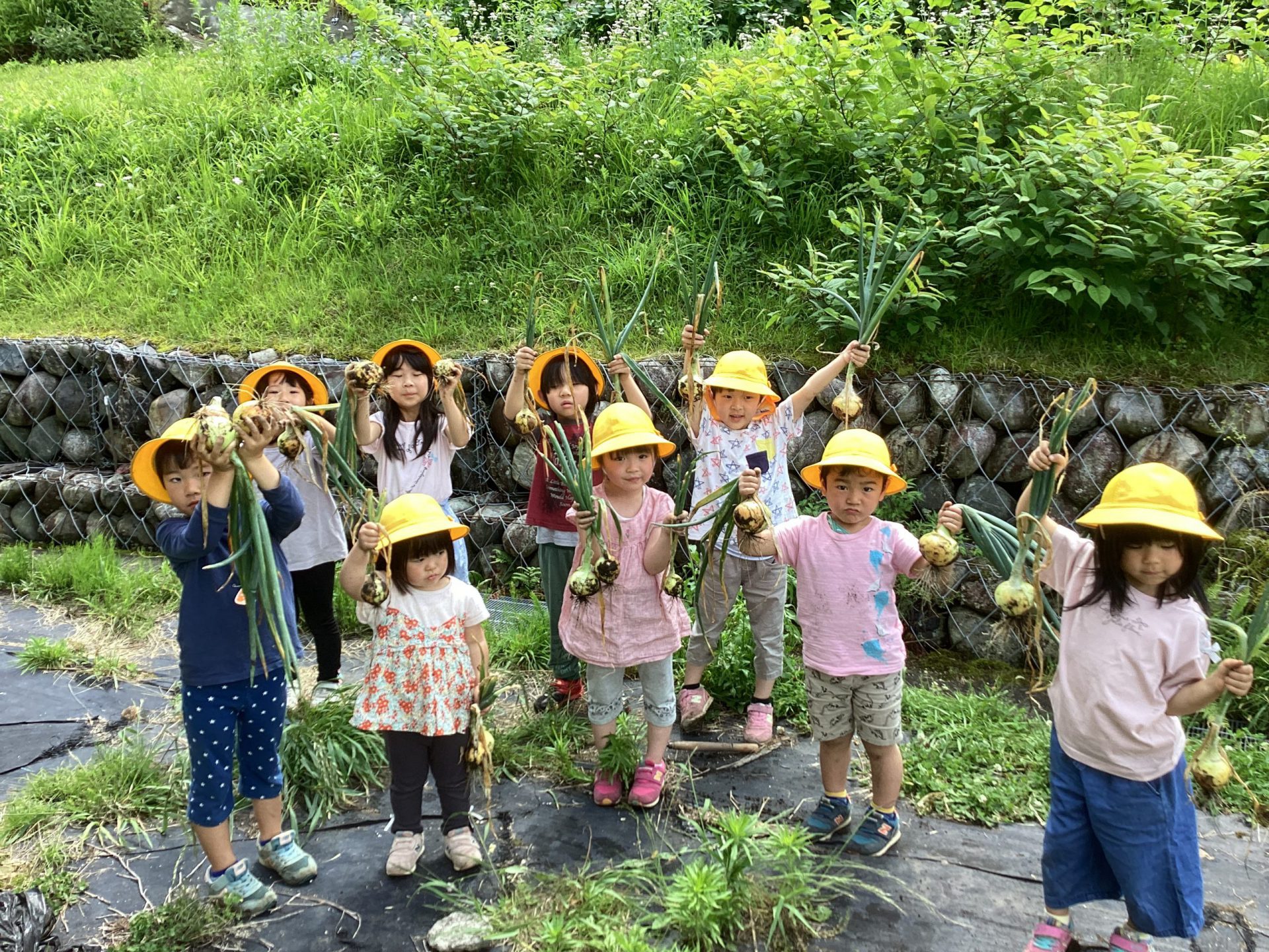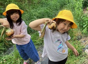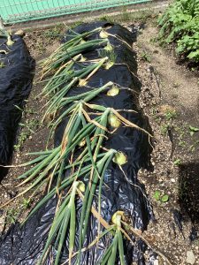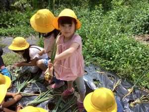 こちらは玉ねぎです。昨年の11月に秋の収穫祭でぞう組(年長児)が調理していたのを見て、『自分たちもぞう組になったら、カレーを作って調理したい』という思いから、玉ねぎを育てていました。無事越冬後も順調に育ち、6月7日(水)に収穫しました。茎も倒れて、玉ねぎも大きくなっていました。