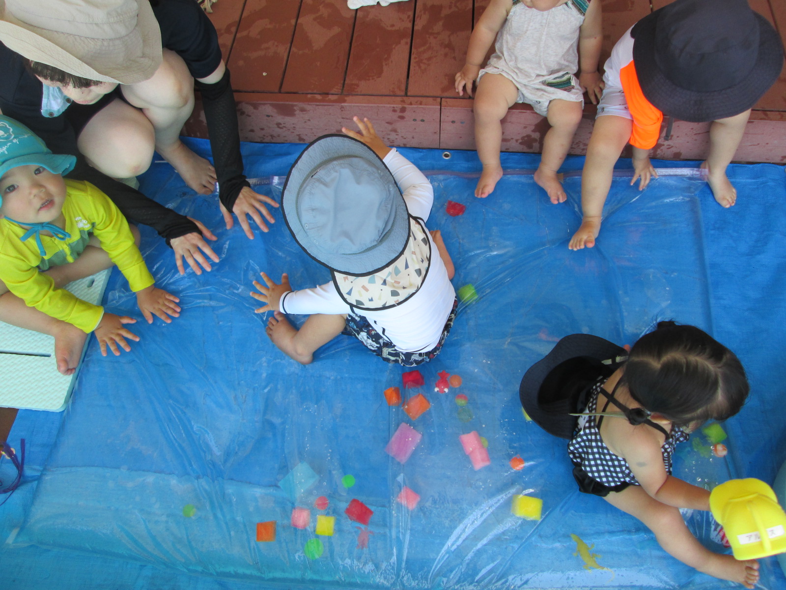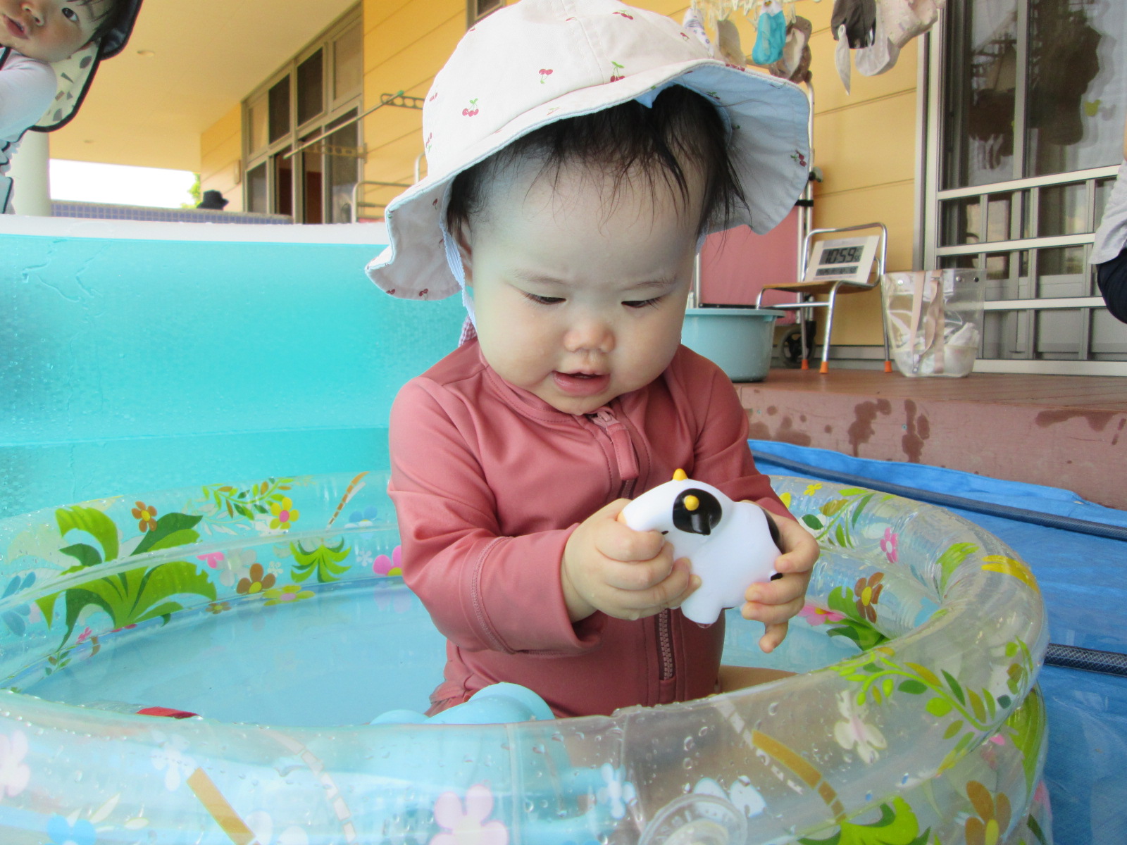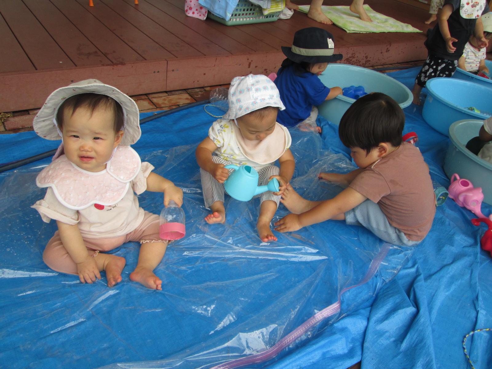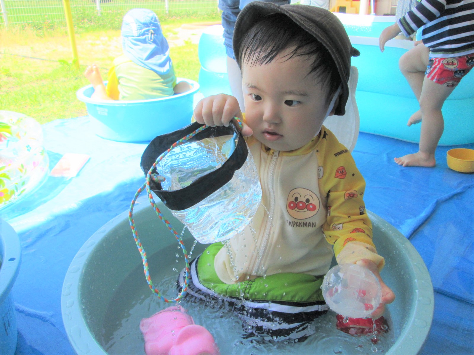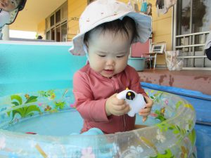 ・月齢や経験が違うひとりひとりの子ども達が、水や玩具へ興味をもちながら安全に水・プール遊びができるように体調面の把握や時間帯、長さに配慮する中で、遊び込める環境づくりに努めてきました。