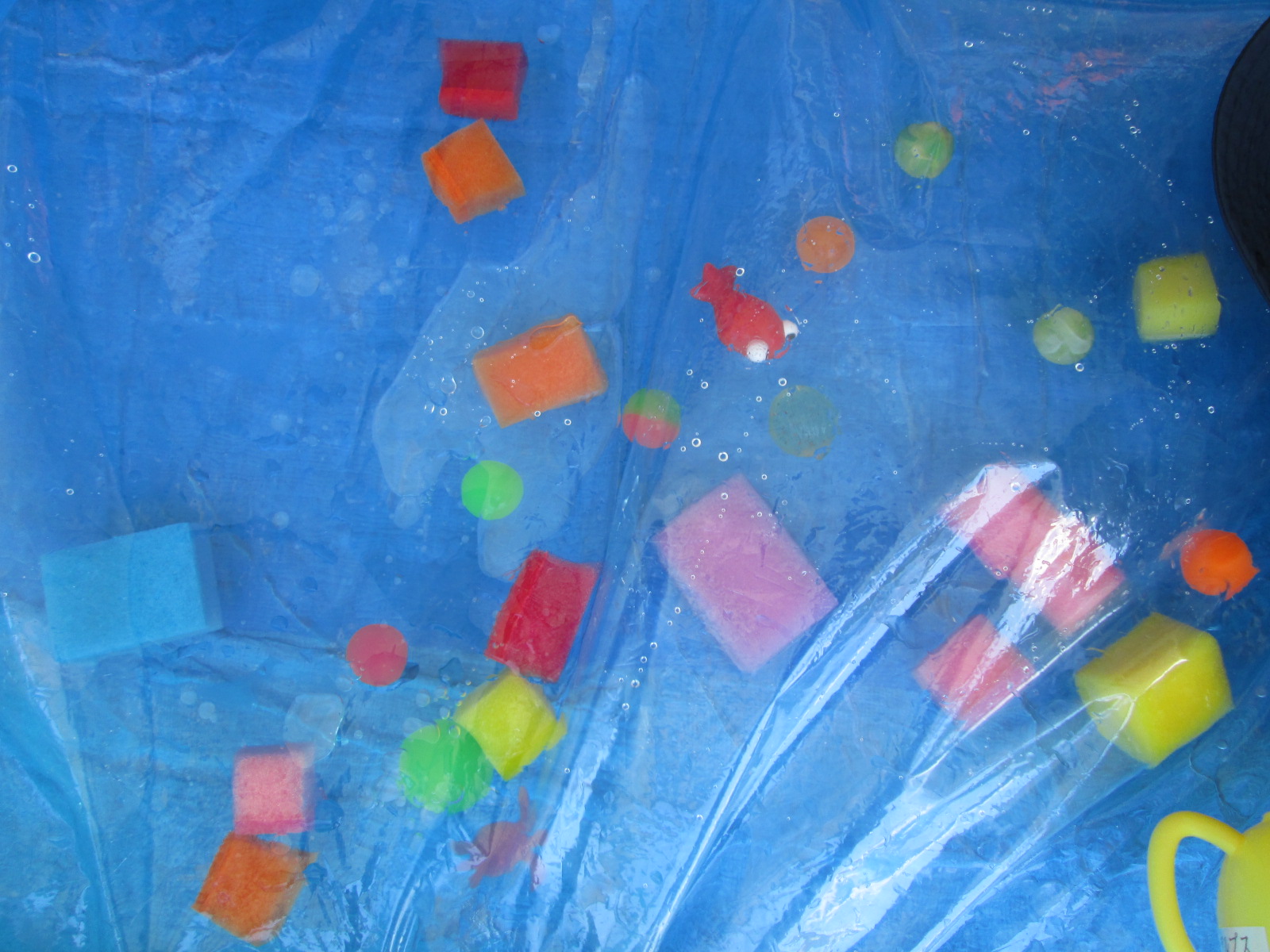布団圧縮袋に水を入れ興味や感触が味わえるように小さく切ったスポンジ、スーパーボールなどを入れてみました。