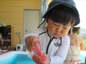 手にとった”うしさんの水鉄砲”をじ〜っとみつめるゆっちゃん。