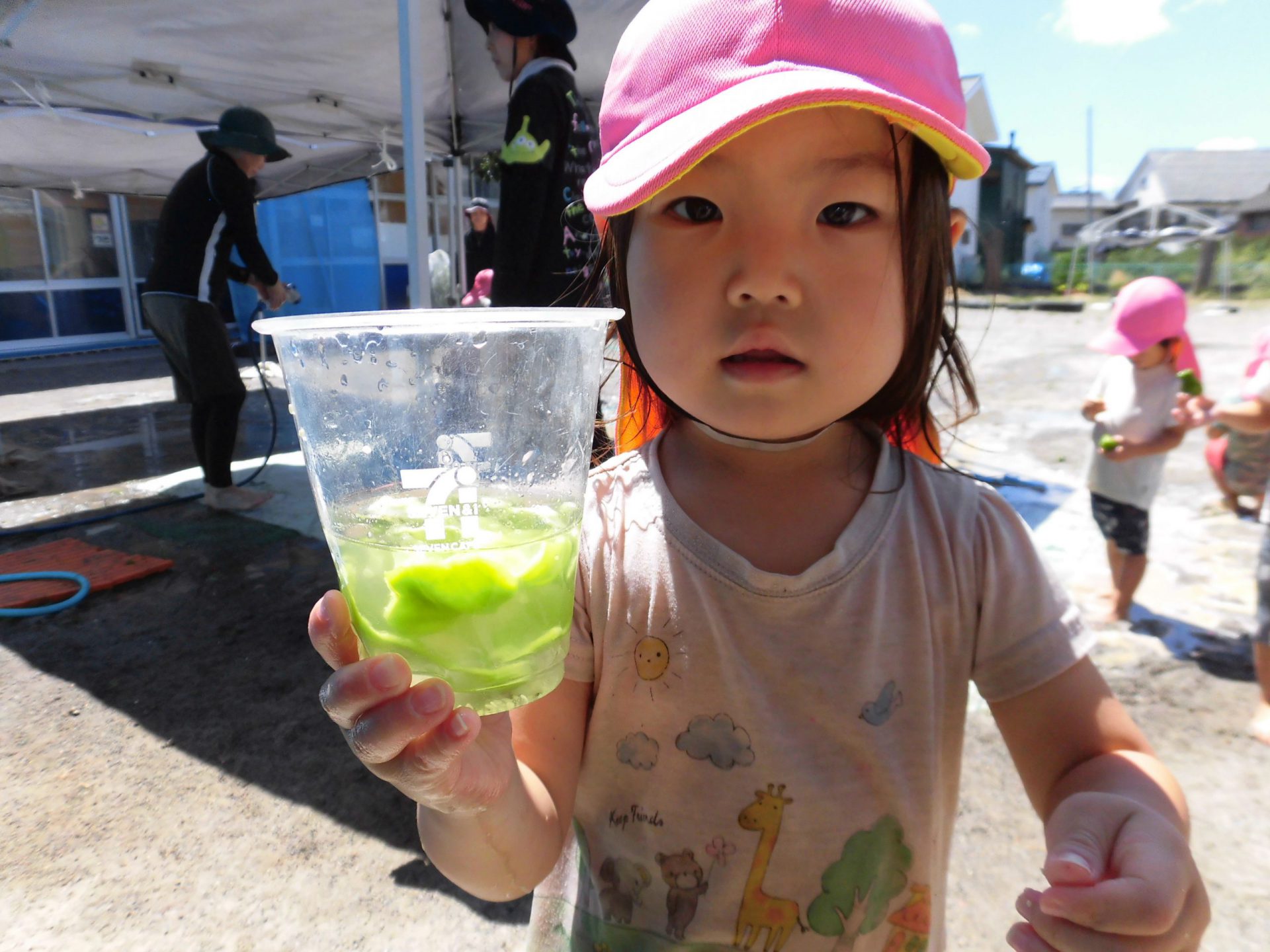 飲んで見せた保育士が「あーおいしかった!」というと「ふふふ」と満面の笑顔を見せてくれました。