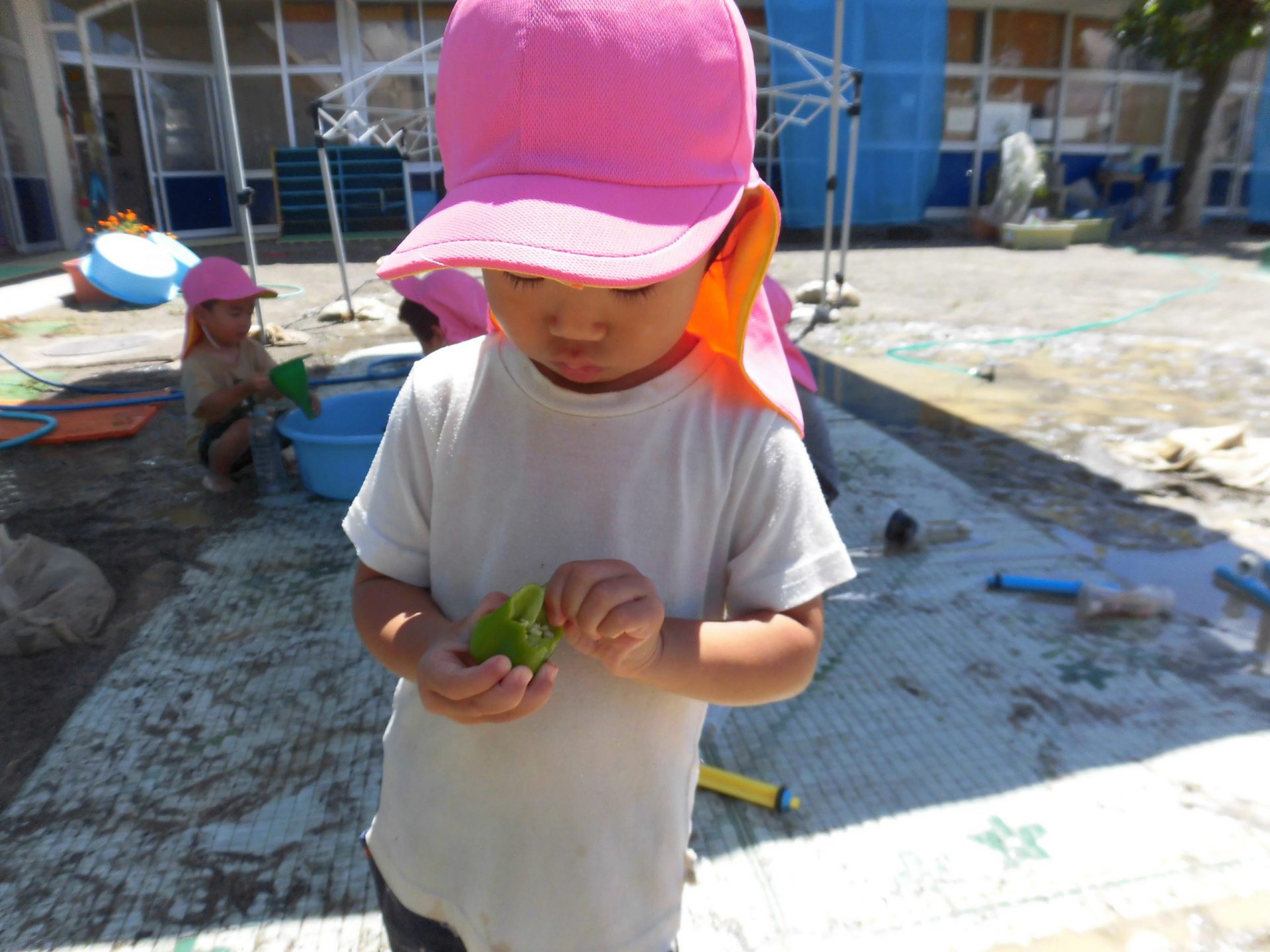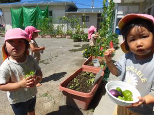 園庭に植えていた野菜が大きく育ち、収穫をしました。