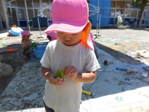 保育士の真似をして水をかき混ぜ、泡を増やしてみたり、たくさんできた泡を優しく握ったり、手に取ってじーっと眺めたりしていました。