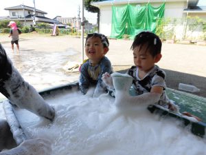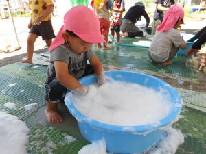 水遊びから、色水遊びや氷遊びと移行し、今日は泡遊びを楽しみました。