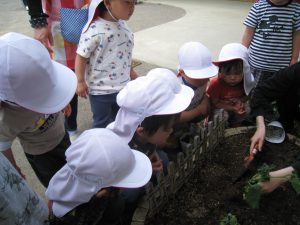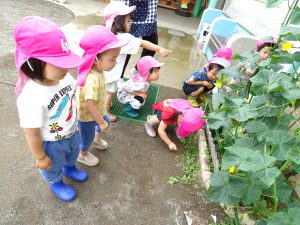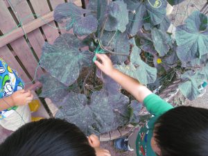 きゅうり、ピーマンの苗を子ども達と一緒に植えました。きゅうりとピーマンの葉の違いを見つけたり、花や実が咲いているのに気が付いて友達同士で共有している姿がありました。