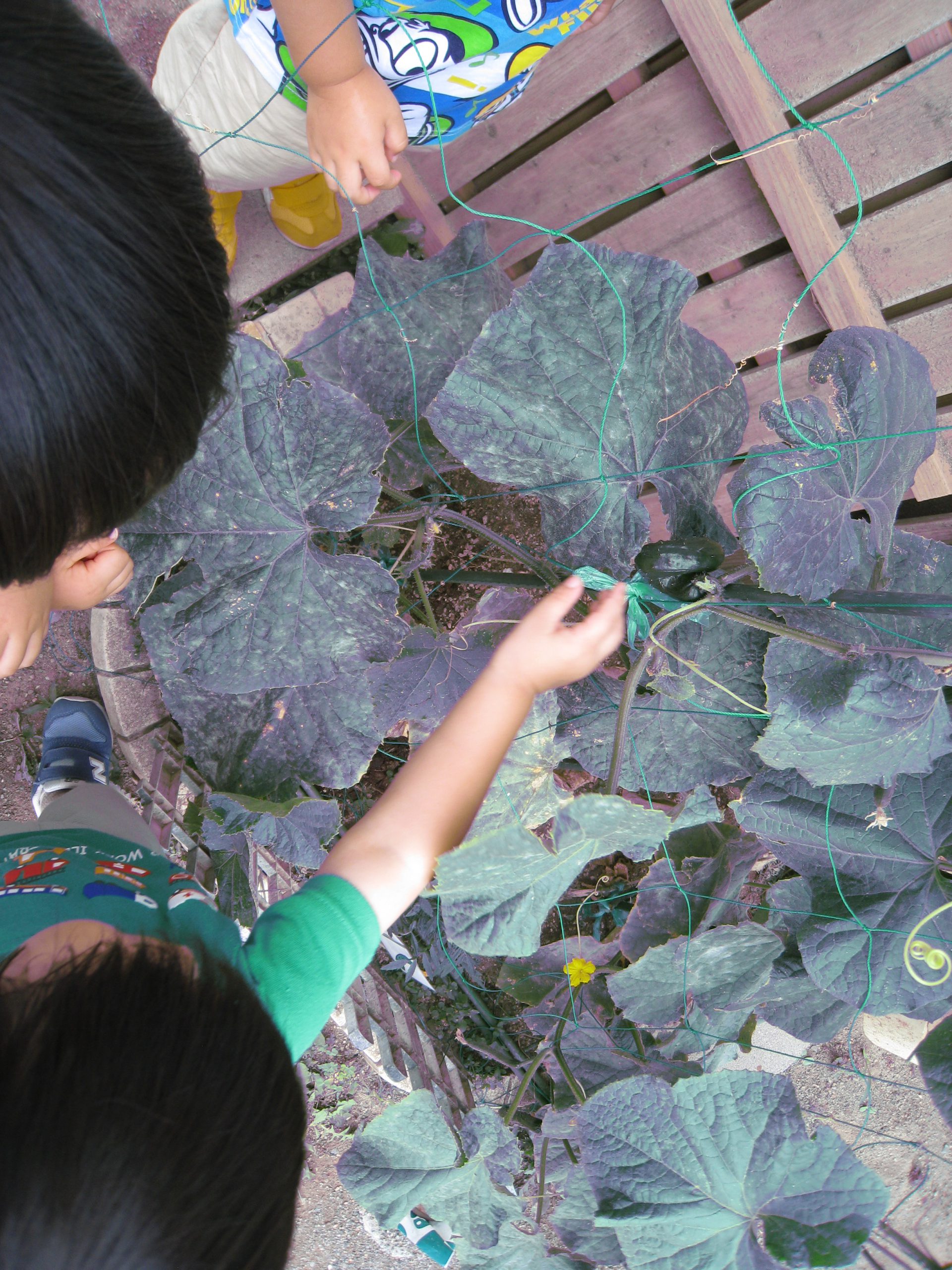 毎日「赤ちゃんきゅうりができている!」「明日はもっと大きくなっているかな?」などと畑を見て友達と成長を喜び、収穫することを楽しみにしていました。