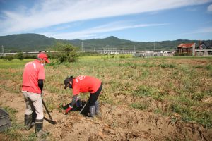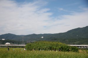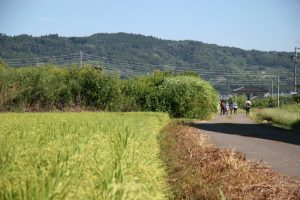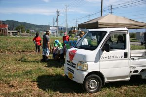 今日も猛暑日の予報です。朝一番におでかけ。ジャガイモを掘りに行くのです。稲が実ってきた田んぼの横を通って、地域の「ミールマ~マ」さんの畑に向かいます。