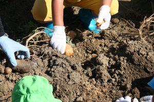 「これがブニョブニョのお芋だよ」 「ぜんぜんちがうね~」見た目も感触もホントに違う作物みたいです
