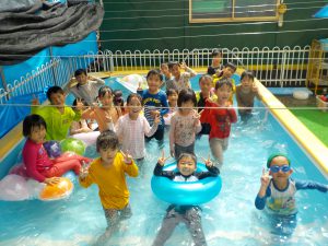 園庭でスライダーをしていると「先生プールしたい」「いこう!行こう」またまたみんなでプールを楽しんだよ~~🏊プカプカー😁