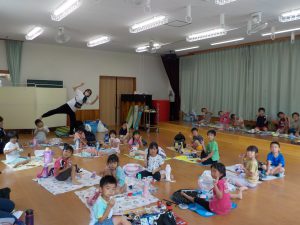 あれ~なんとなく見たことあるかも~「あっ!久しぶり✋」なんて声をかけている子も・・・でもやっぱり「沢山人がいるな~💦」と、圧倒されてしまう子もいたけど、一緒に体操して、帽子も濡らして・・さて川へ出発進行!!