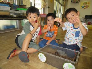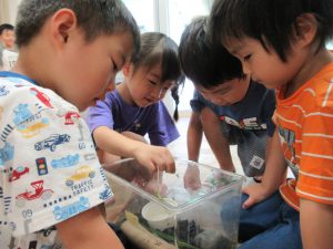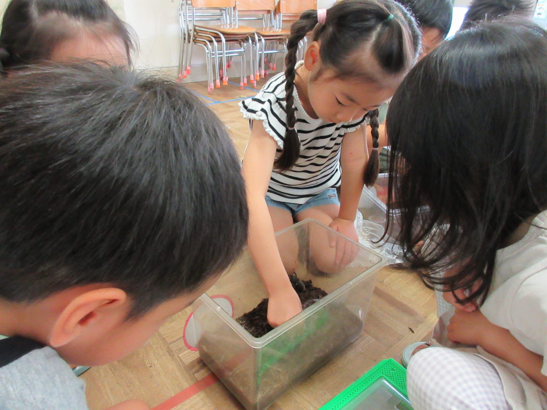 ある日、「先生この中(飼育ケースの中)にカブトムシがいる!」「入ってきたのかな?」「でも蓋は閉まってるね」と考える子ども達。