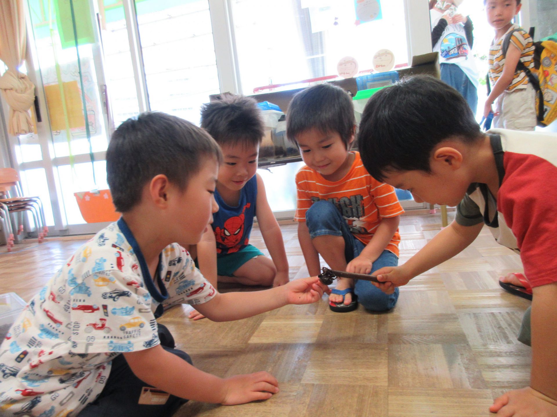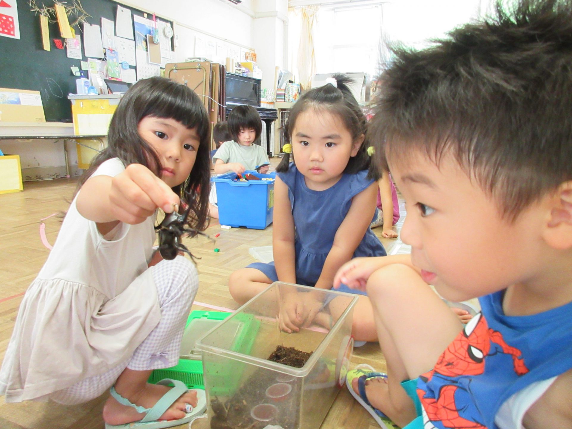 カブトムシの持ち方を知っている子が周りの友達に持ち方を教えてあげる姿も。