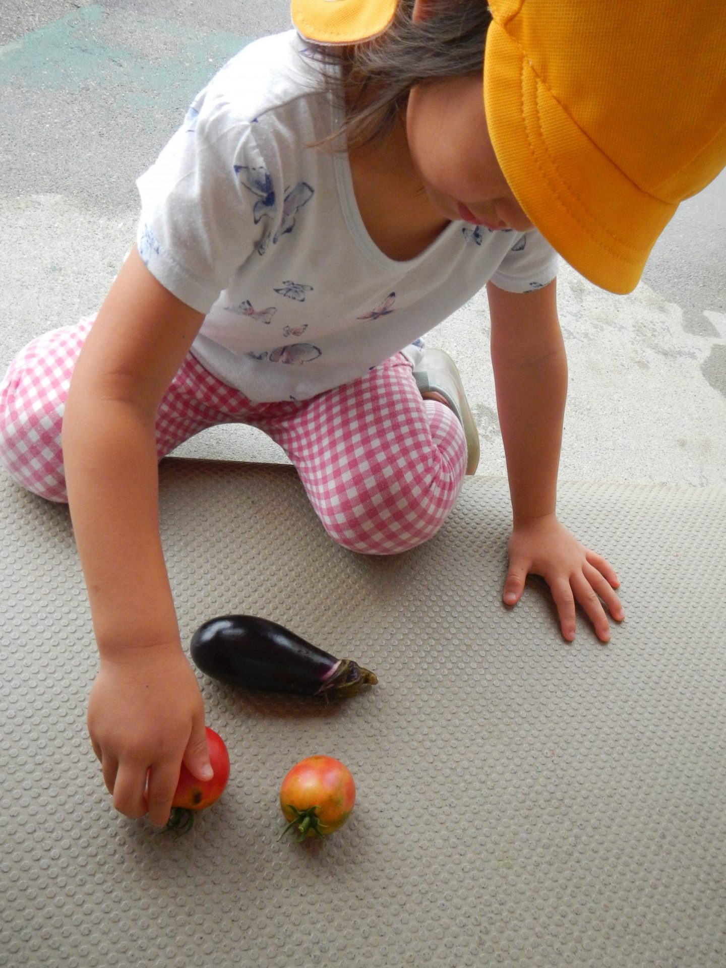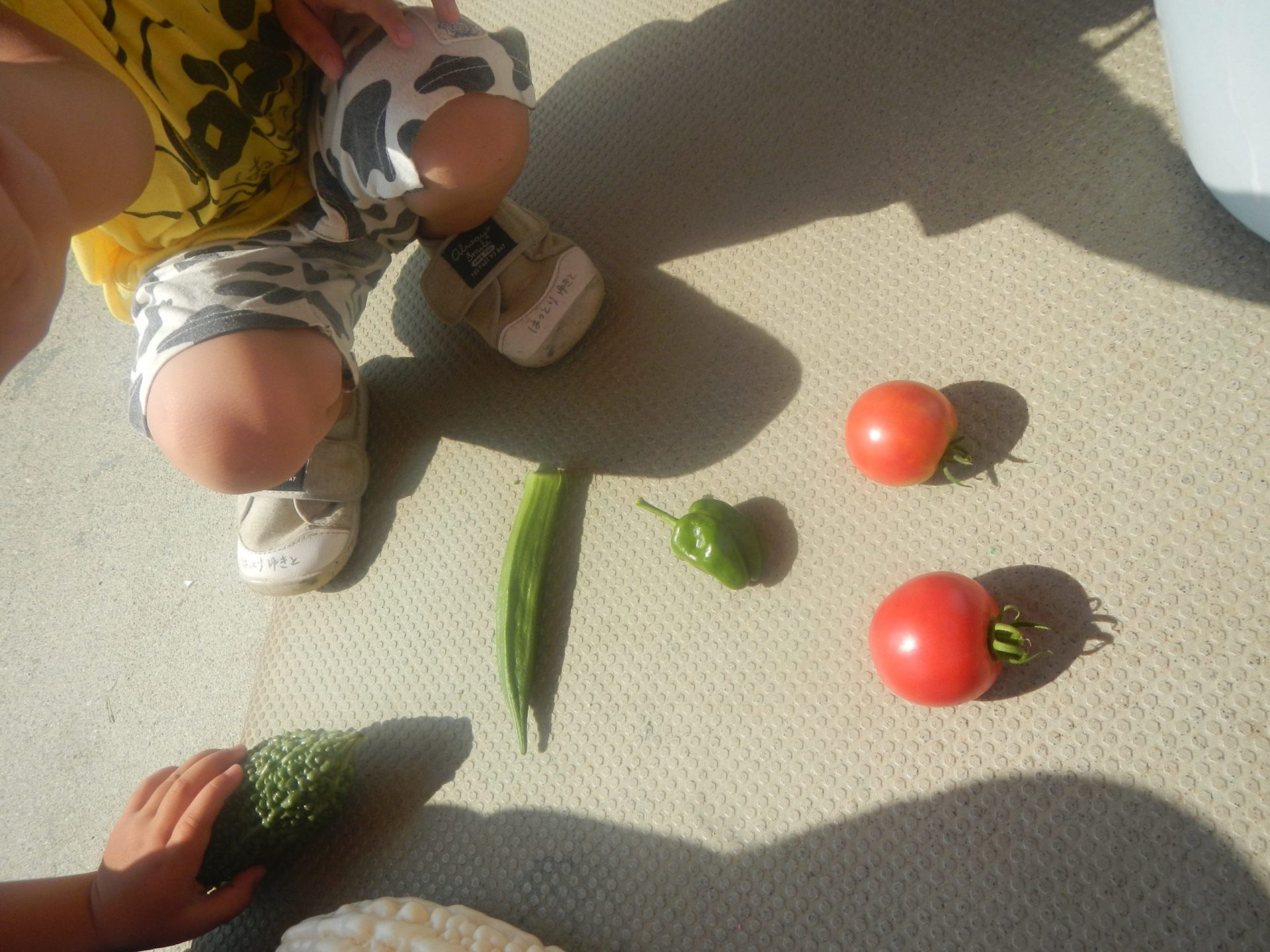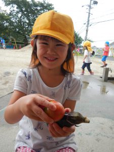 ・夏の野菜も終わりに近くなり、収穫できる物が減ってきています。葉が多く茂っている中から葉をかき分けて見つけると「あった〜!」と目を丸くして担任に知らせてくれる子どもたち。まるで宝探しです。