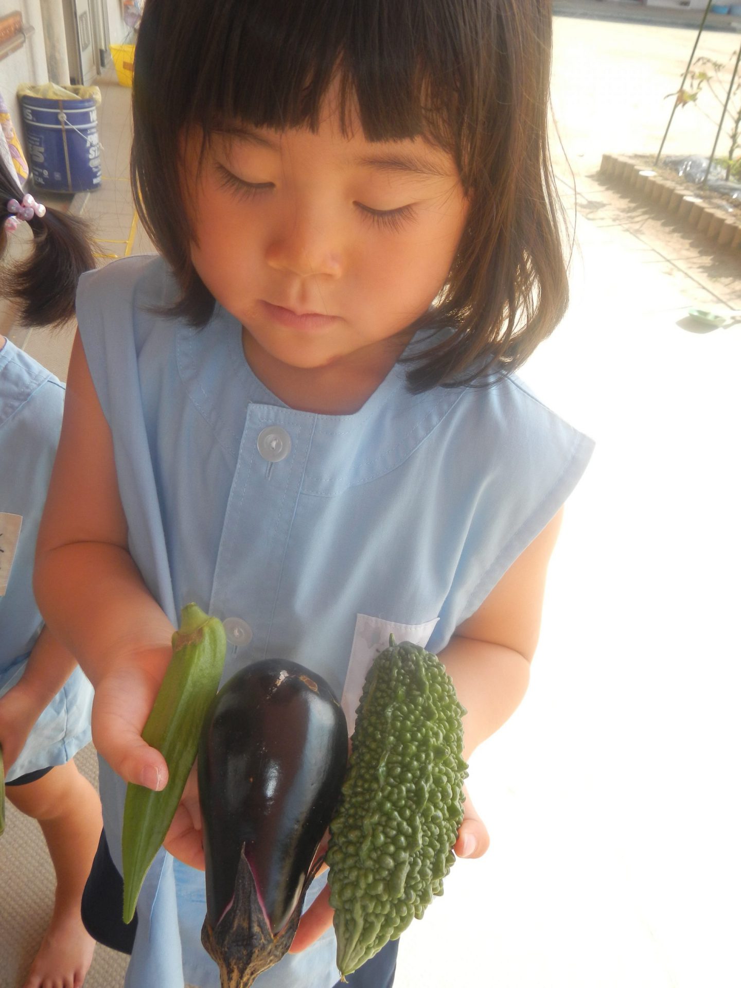 ・年長さんに教えてもらいながら畑の野菜に触れてきた年少さん。給食のときは「このきゅうりは保育園の味だ。」「おいしい〜」と旬の味をいっぱい味わってきました。