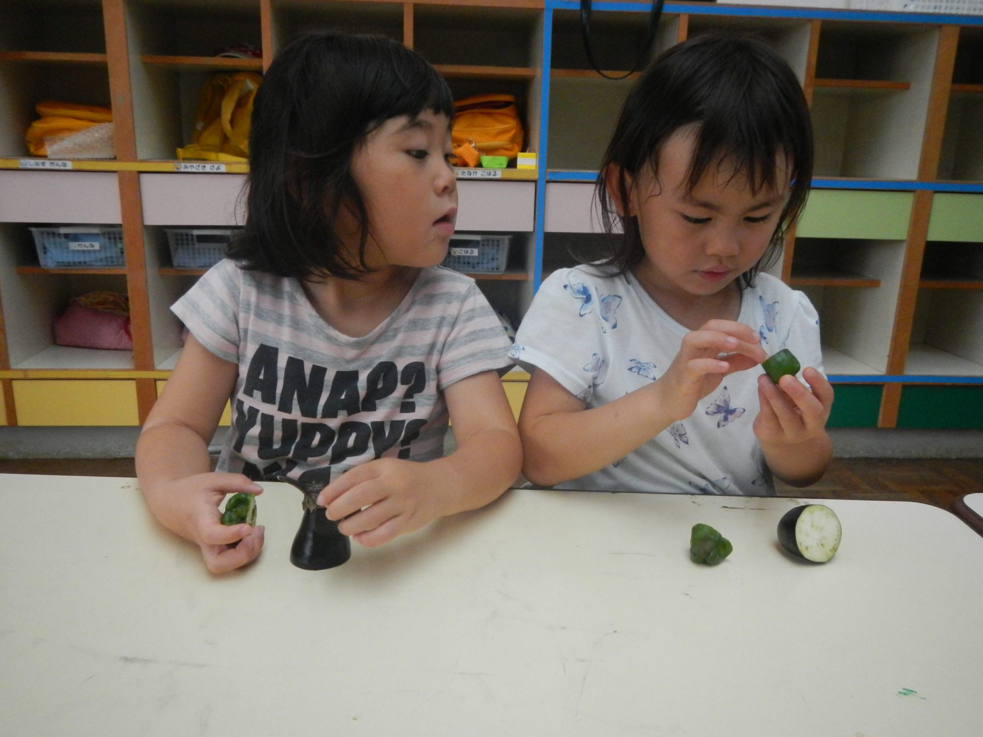 野菜を切ってみました。「(ナスの中の)この黒いのなにかなぁ・・・?」