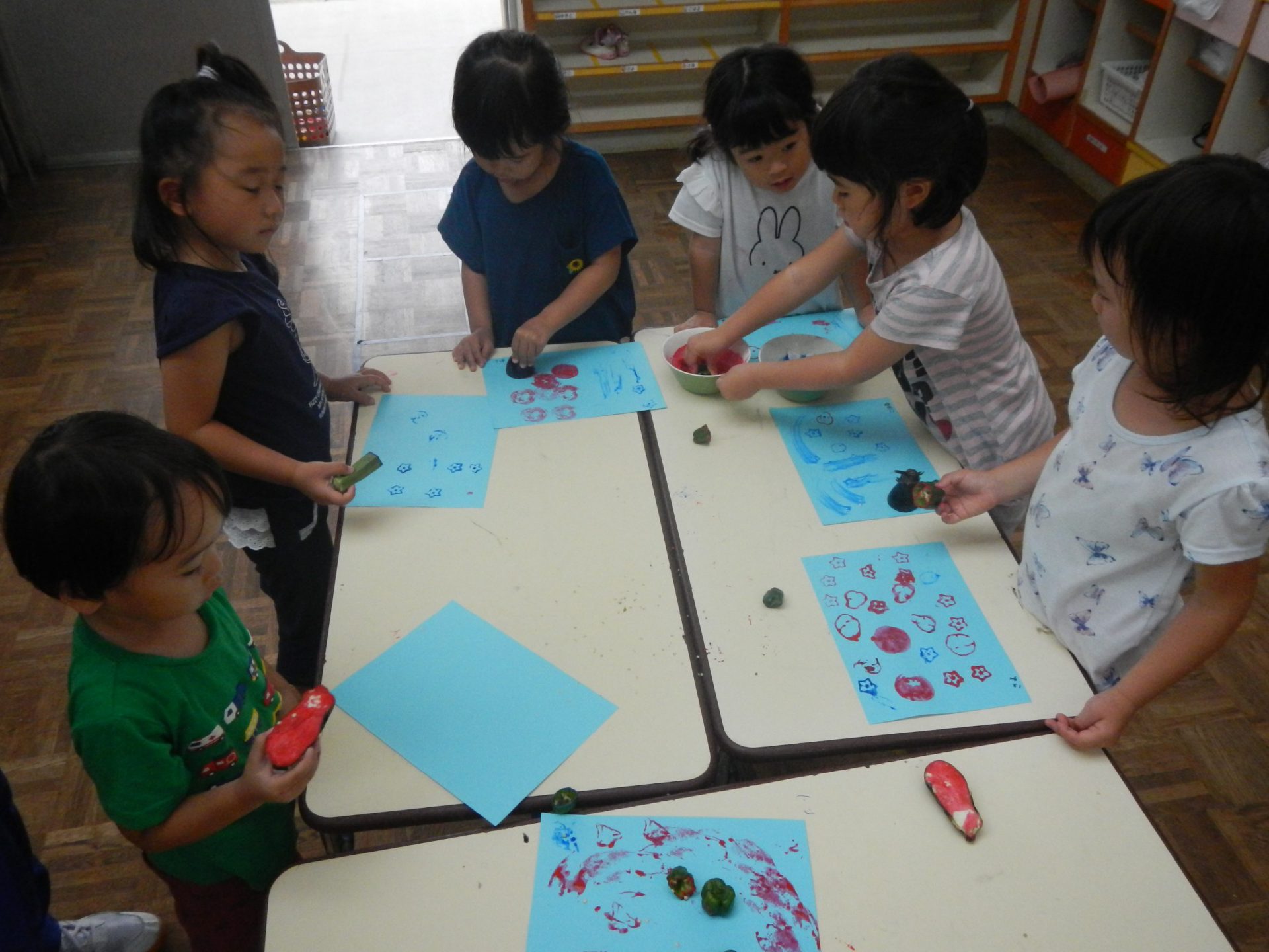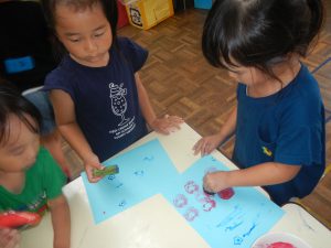 ・子どもたちはテラスに並べて顔にしたり、スタンプ遊びを楽しみながらながら「流れ星」を見つけたりして年少児でもいろんな発想があり、イメージを広げて楽しむ姿が可愛らしく、大事に育てていきたいと感じました。