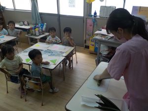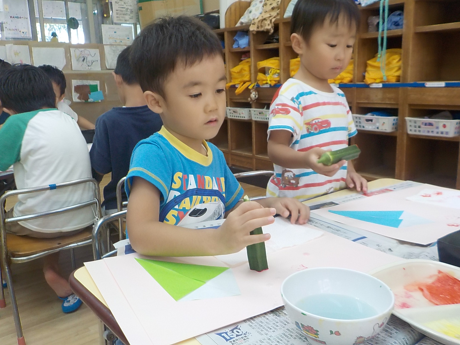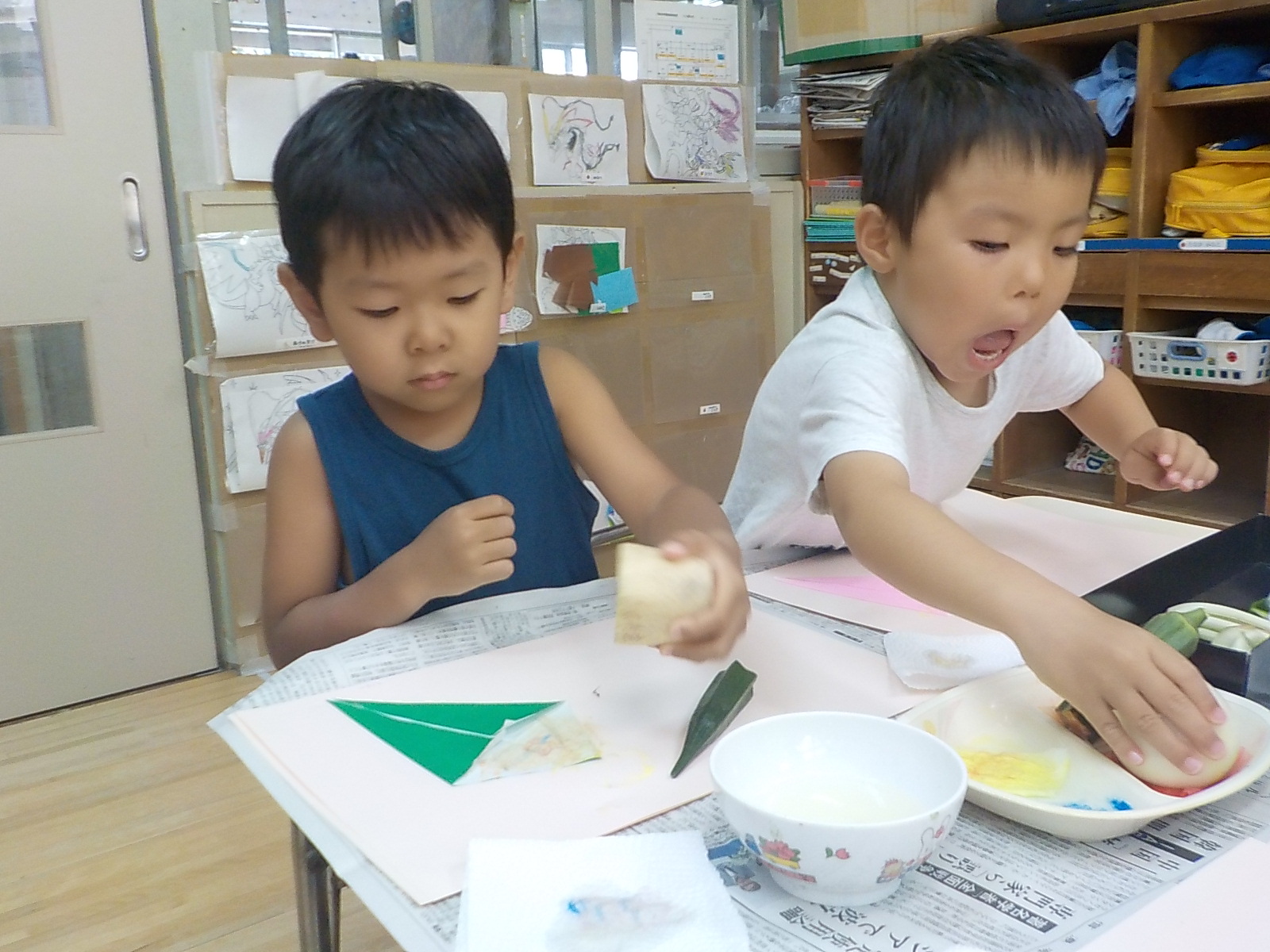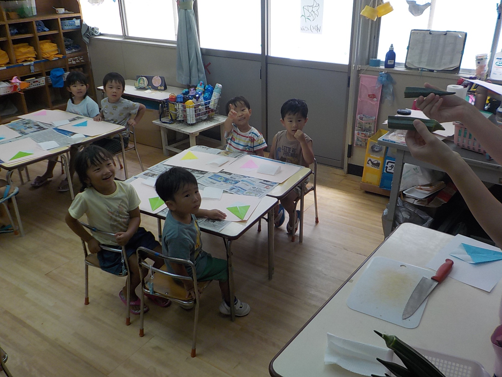 ・種を蒔いたり、苗を植えたりして子どもたちが一生懸命育ててきた野菜、給食に入れて食べたり、家におみやげに持って帰ったりしていっぱい食べることができました。 採り忘れて大きくなりすぎてしまったオクラですが、そのままダメにしてしまうのではなく、スタンプ遊びを楽しみました。 オクラだけでなく他の野菜も使ってみたことで、野菜の断面から中がどんな形をしているのか、種があるものや匂いを直接感じることができ、給食を食べるときも入っている野菜をみつけ話題にしたりしていた姿が見られ、野菜を食べることに対してもより意欲的になれたように感じました。 スタンプしたものを祖父母へのプレゼントにしたことで、家庭でも話題にしてもらえ、子どもたちもうれしかったのではないかと思います。