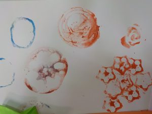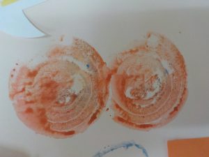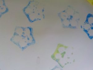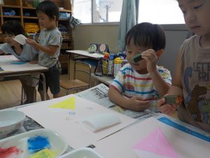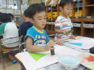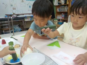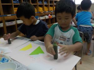 さっそく絵の具をつけてみました。 画用紙の上にスタンプを押していくといろんな形ができてそのたびに子どもたちから声があがります。