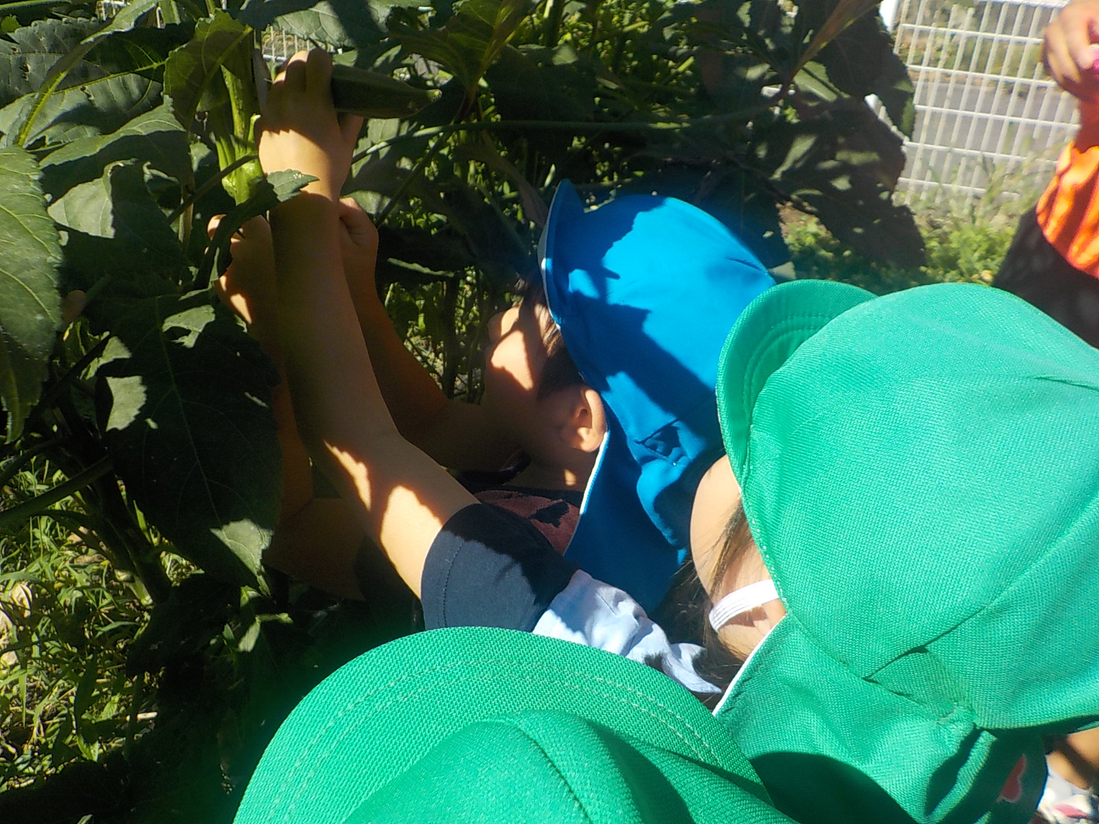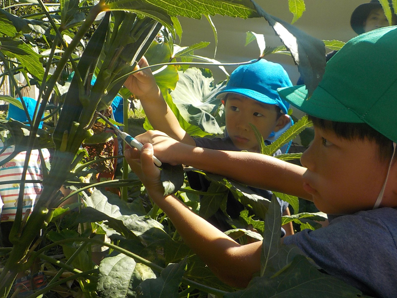 前日に、年長さんへ「オクラください!」とお願いし、収穫のお手伝いをさせてもらいました。