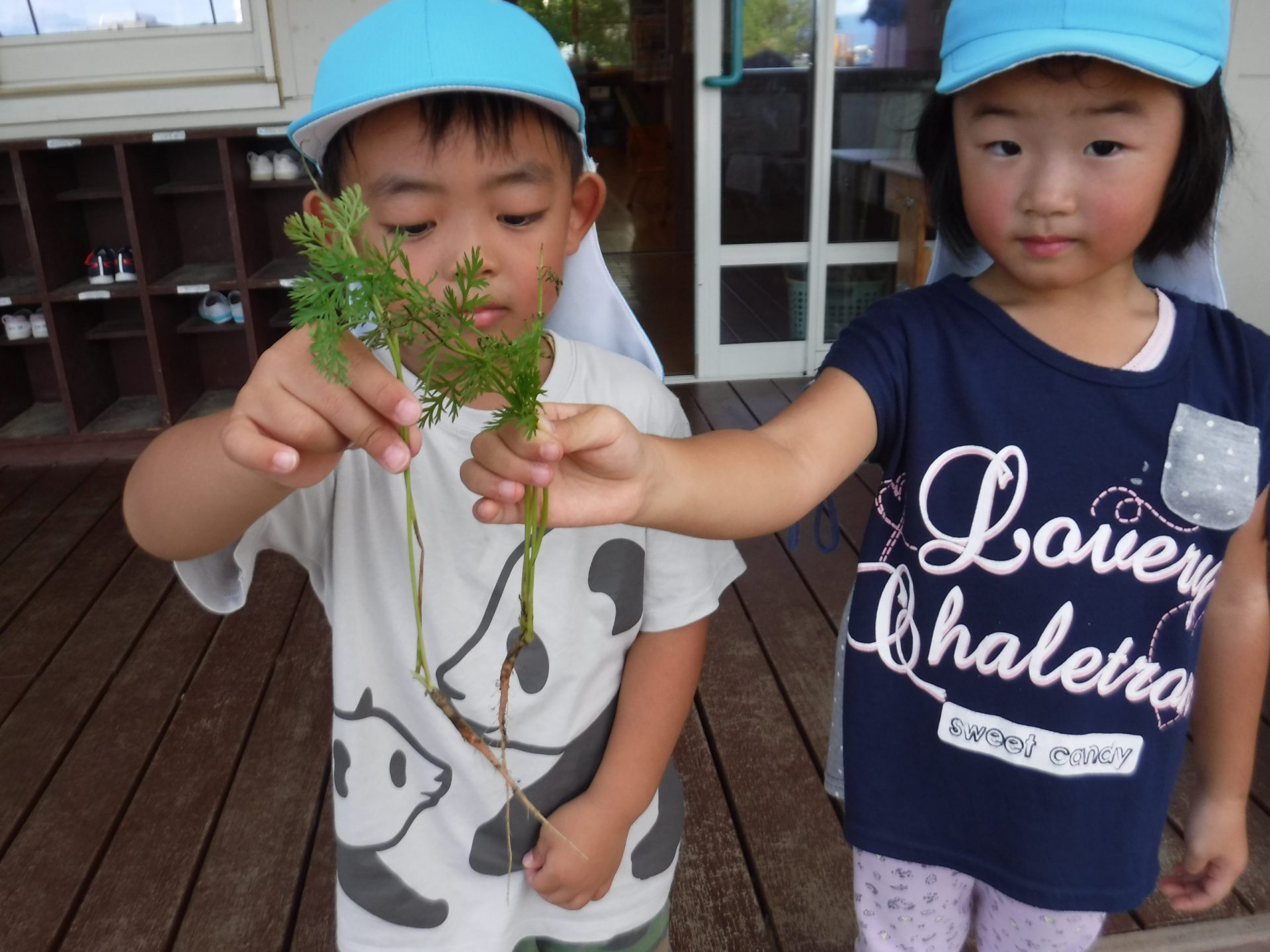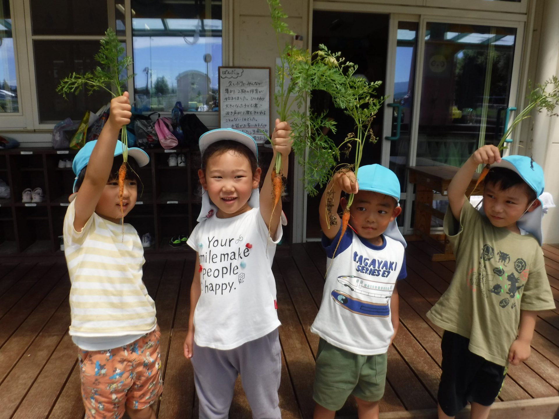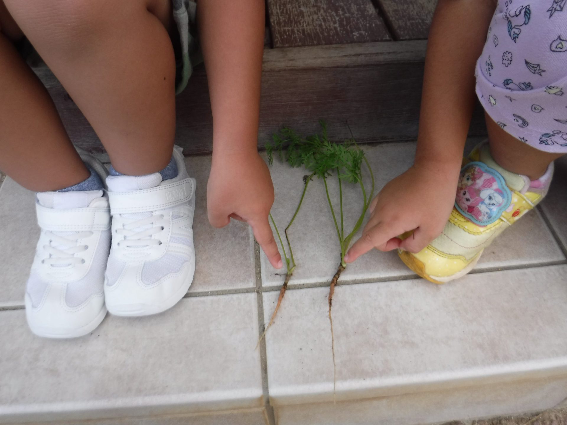 お家の方も人参ができるまでの期間が長い事に驚いたり、初めて葉っぱを食べてみたりする事て゛、新たな発見をすることができたという感想を頂きました。