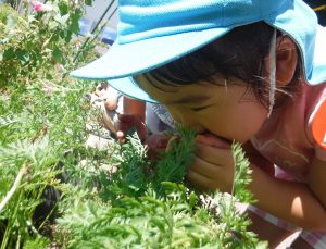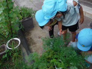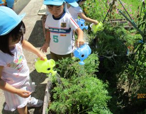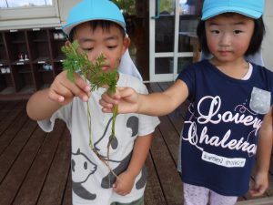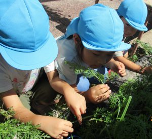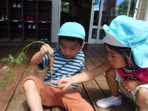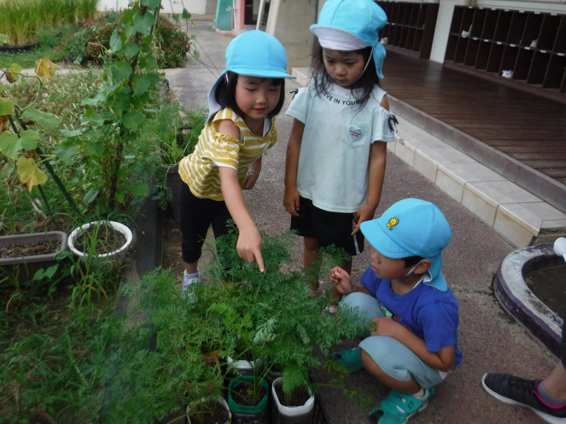9月に入り、年長さんが人参の葉っぱにアゲハチョウがとまっているのを見つけました。