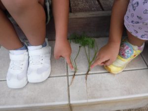 一週間で全員芽が出て、一ヶ月後には人参の葉っぱを親子で収穫!! (7月)