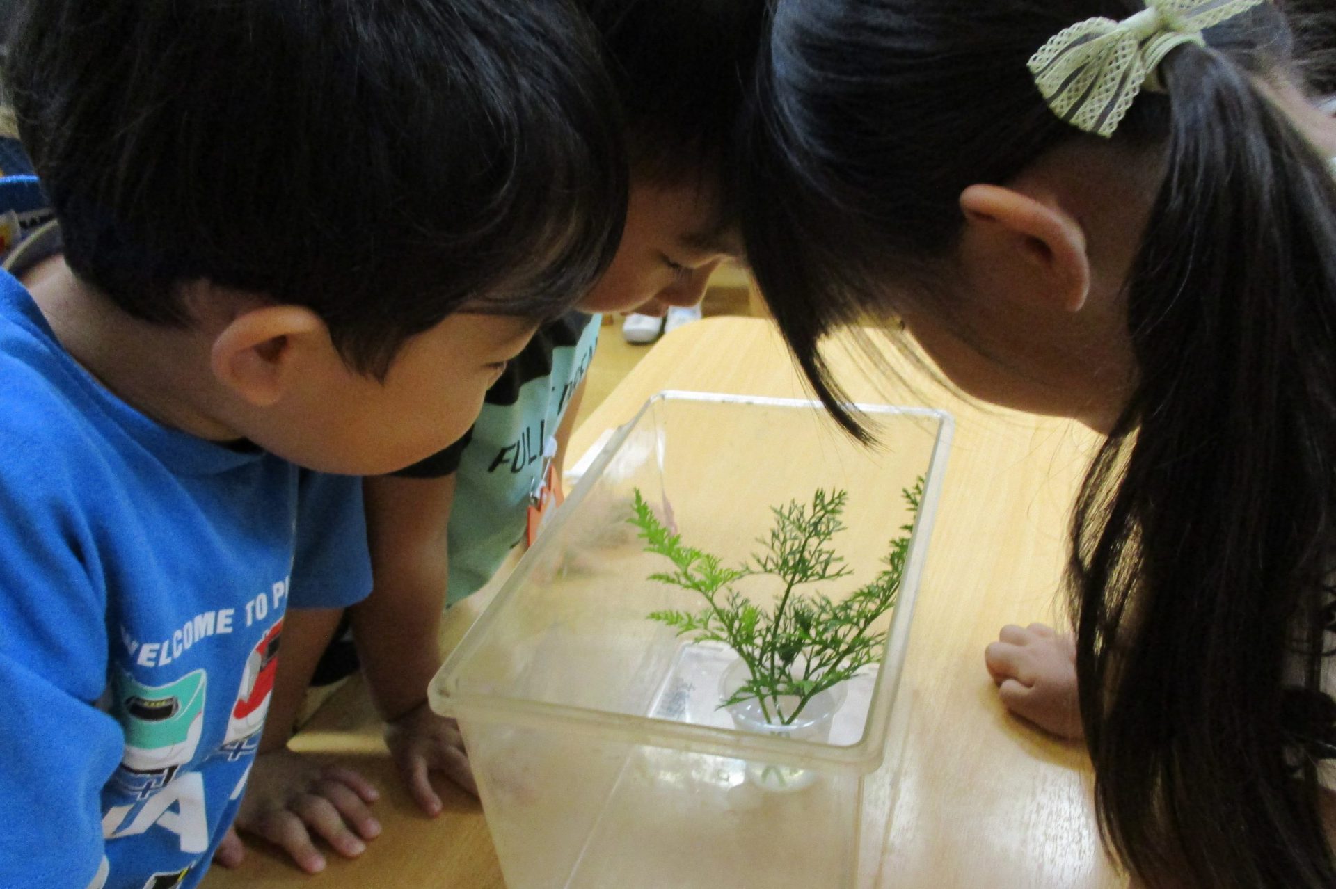 「アオムシ出てくるかなぁ〜」「楽しみだね!!」と見つめる子どもたち。