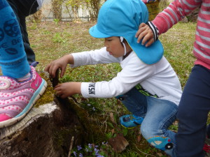 「先生、だんごむしいたよ。」と見せてくれた男の子は大きな切り株の皮をめくってだんご虫を発見!!