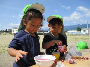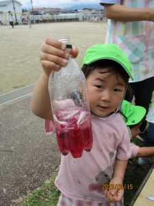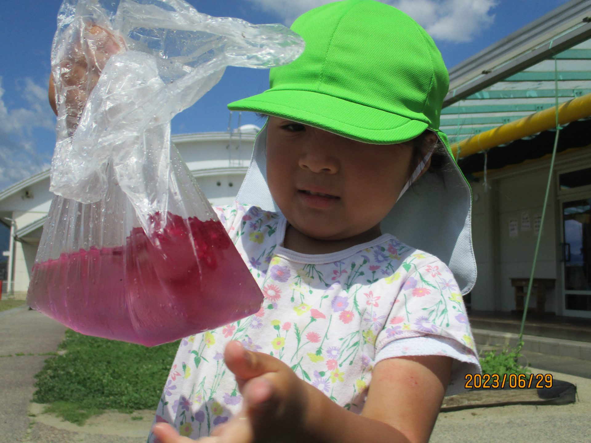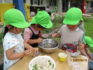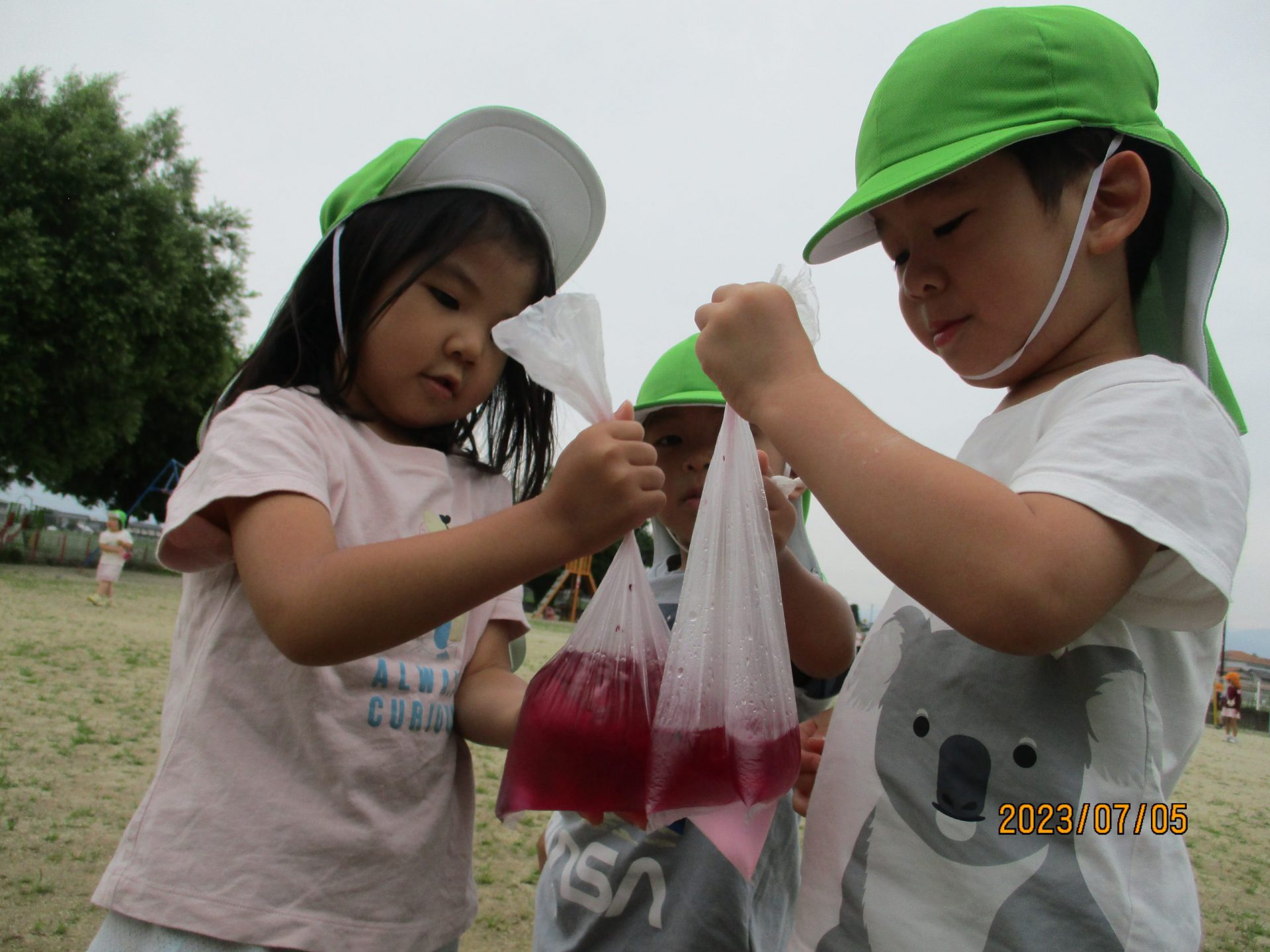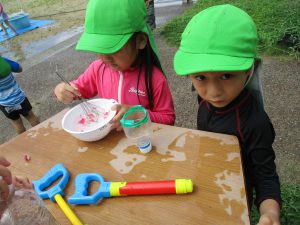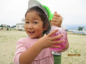 年長さんや年中さんの遊びをじっとのぞいていた年少さんは、様々なことに興味津々です。色水のつくり方、遊び方は年長さんを見ていたのでバッチリ!毎日繰り返し楽しんでいます。