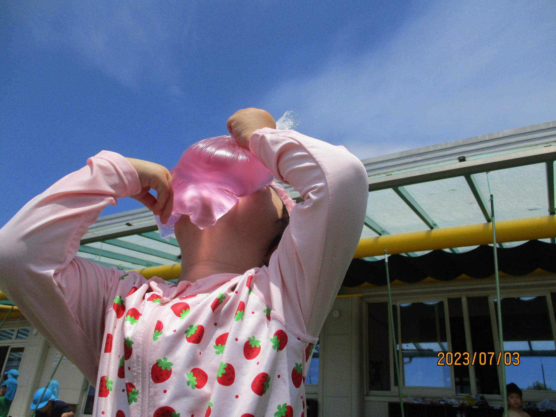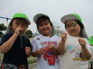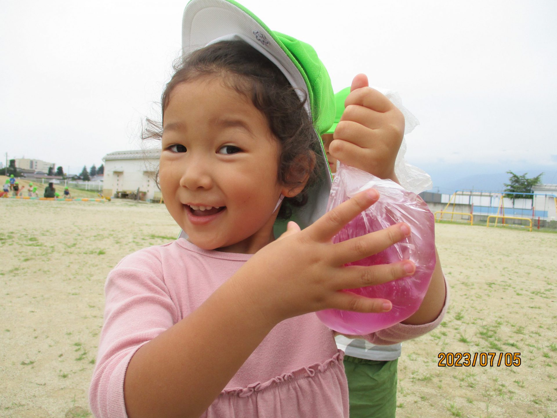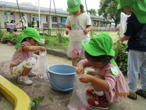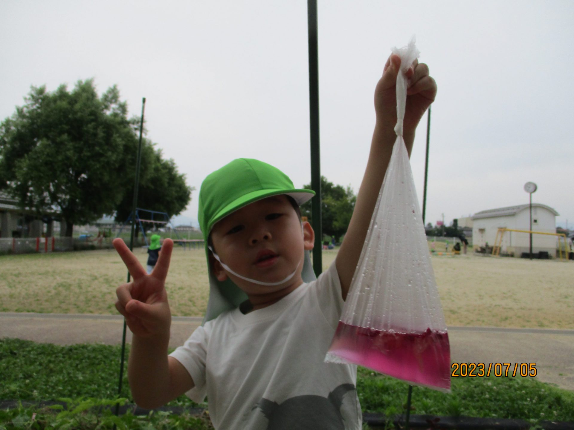 年長さんや年中さんの遊びをじっとのぞいていた年少さんは、様々なことに興味津々です。色水のつくり方、遊び方は年長さんを見ていたのでバッチリ!毎日繰り返し楽しんでいます。