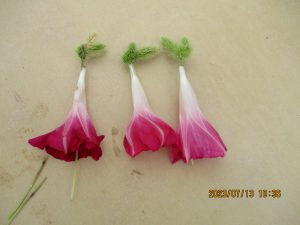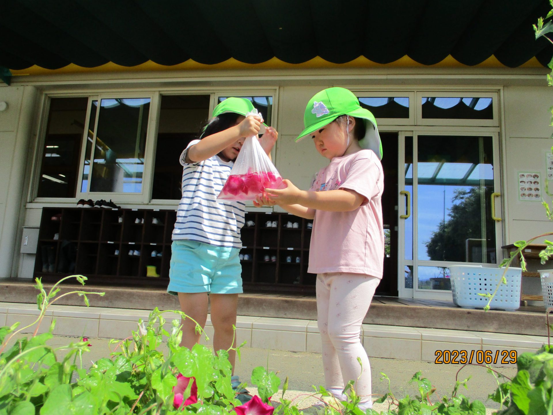 色水あそびでは、遊びが広がるごとに、水の量や花の数など変えながら、試しています。