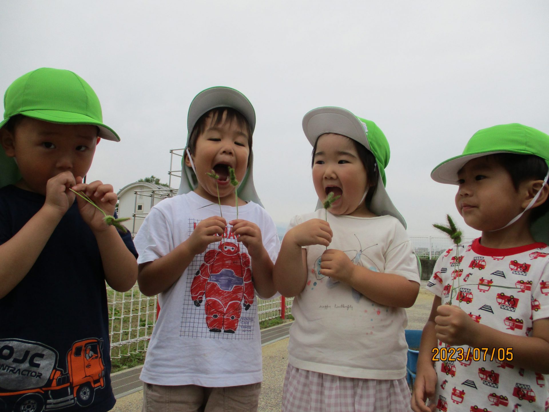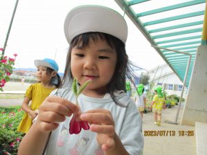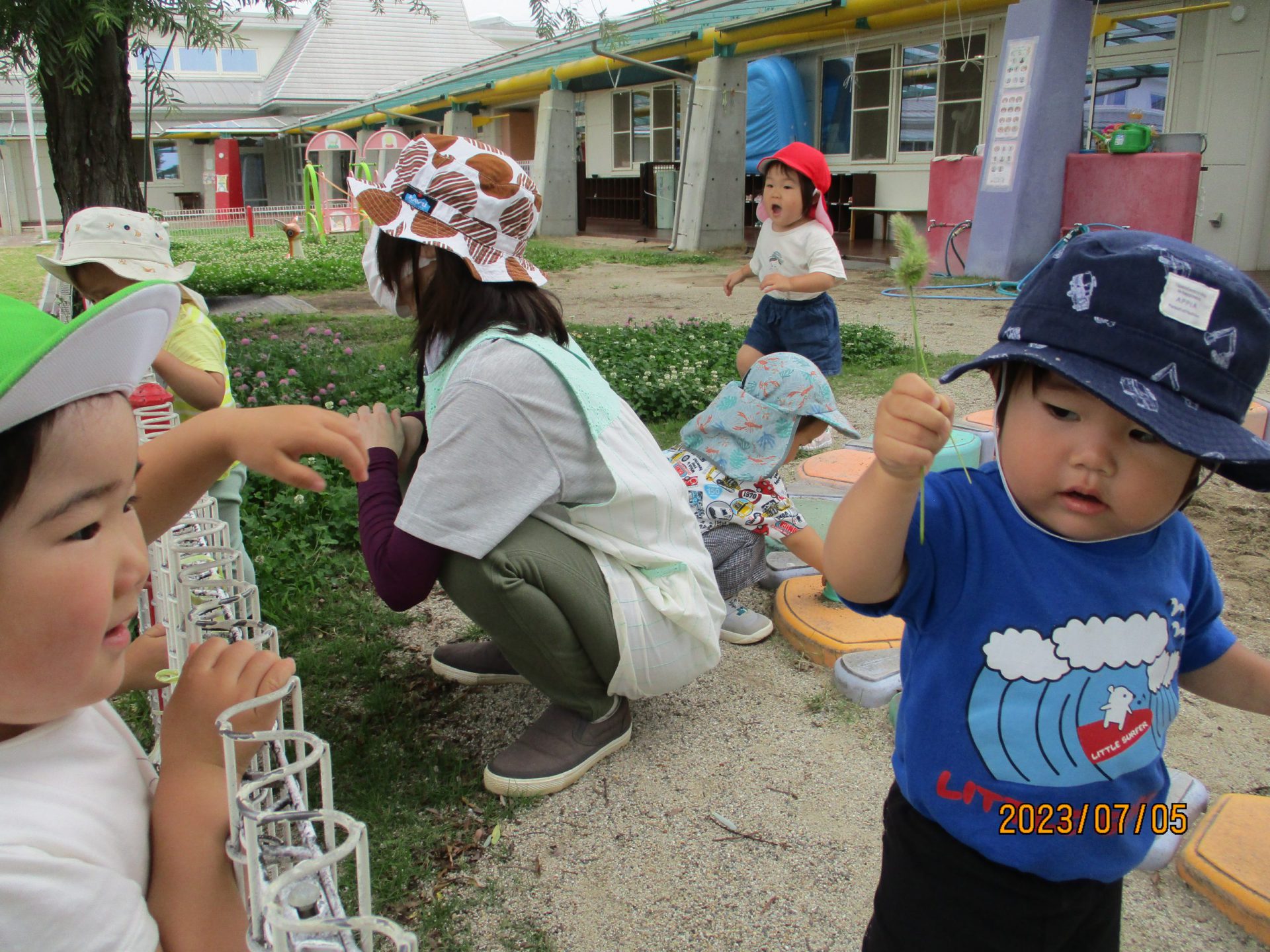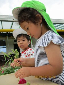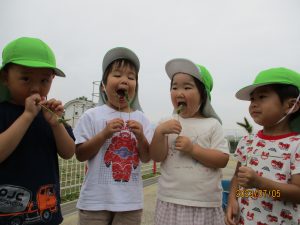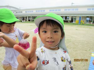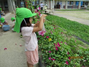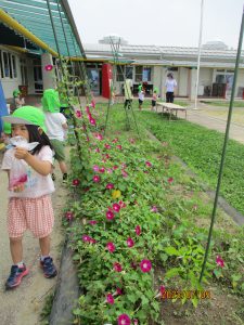 園生活にも慣れ、戸外で元気に遊んでいる子どもたち。テラスの前には沢山の朝顔が咲きました!
