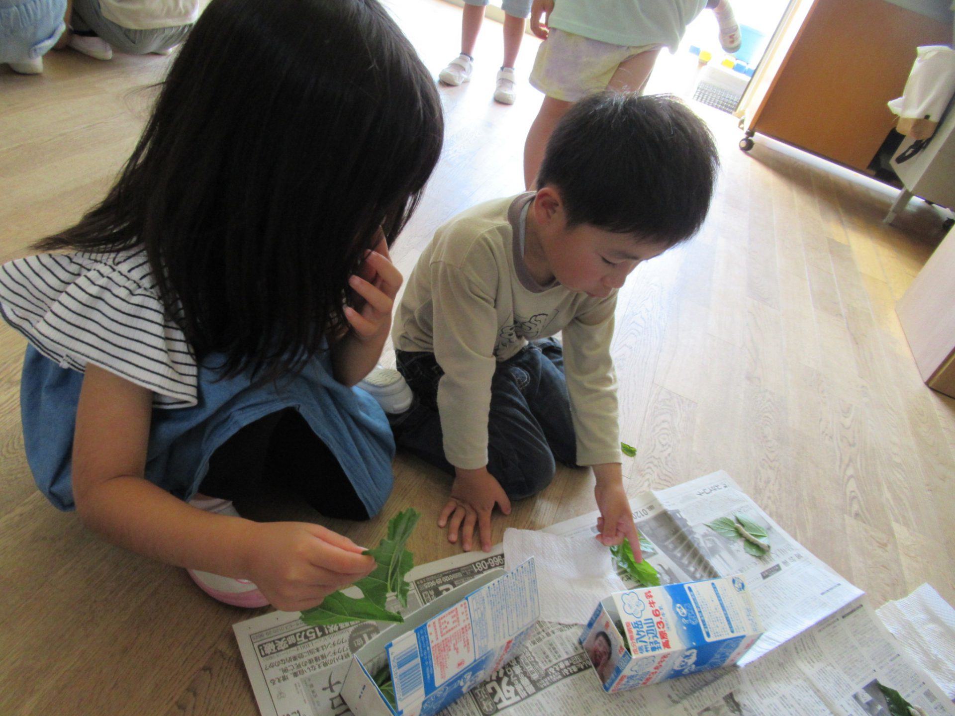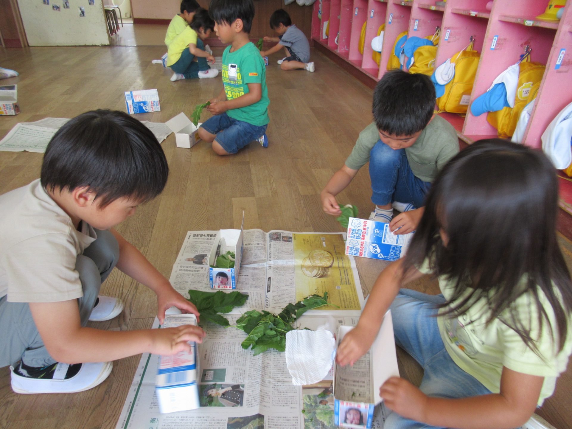 「みんながお蚕さんのパパ・ママだからお世話お願いね」とお話しすると責任感や使命感が生まれたようでお家の掃除や桑の葉を取りに行ってくれるようになり、愛着が湧いてきました。