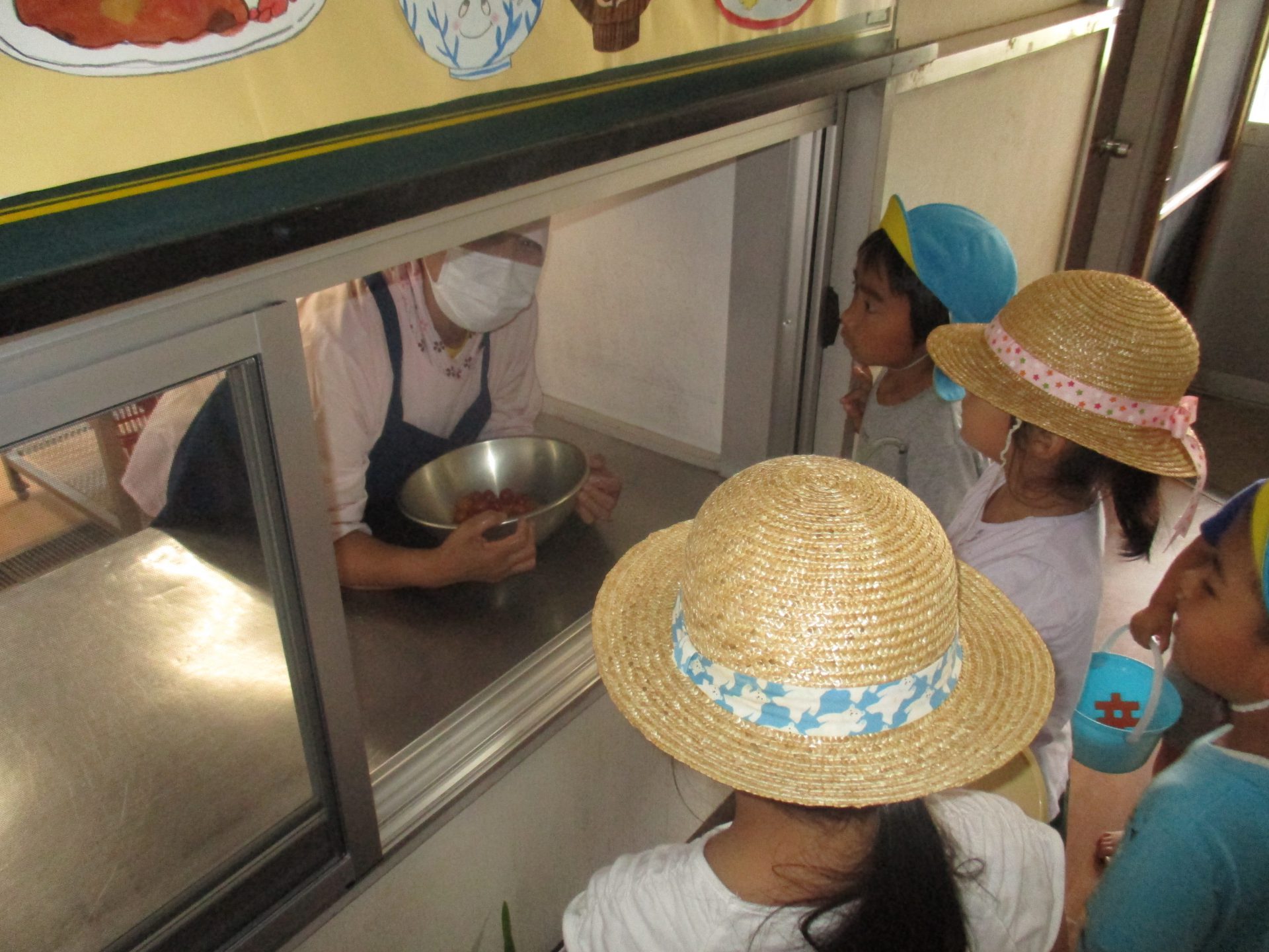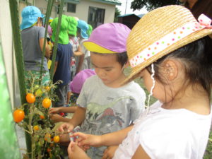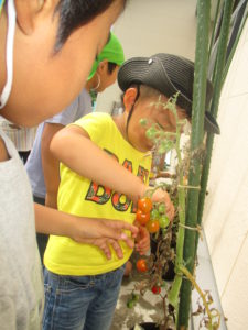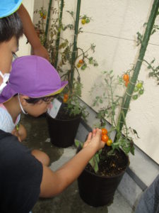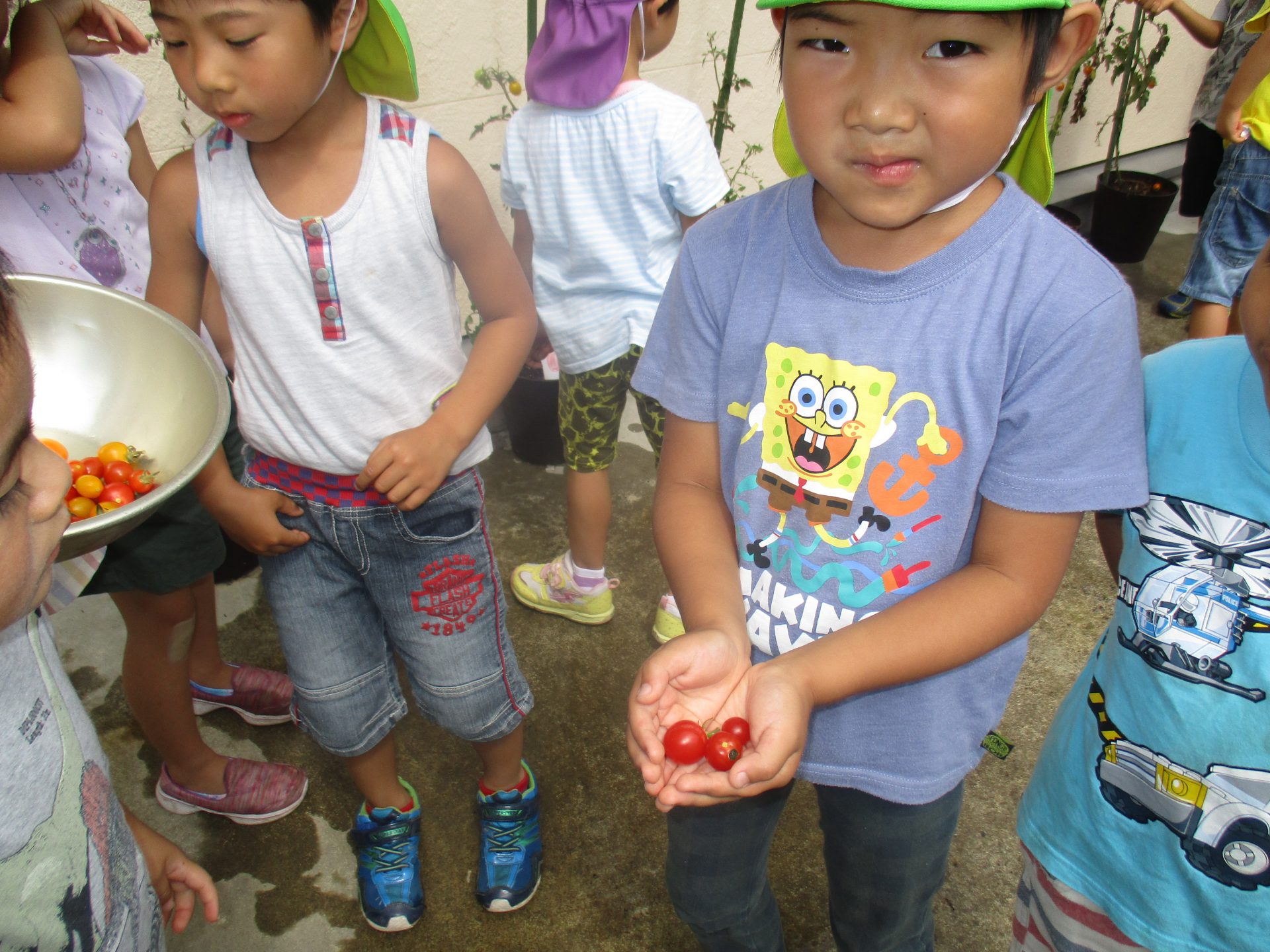 お昼は自分たちで採ったミニトマトを食べて、「甘いよ!」「もっと食べたい!」