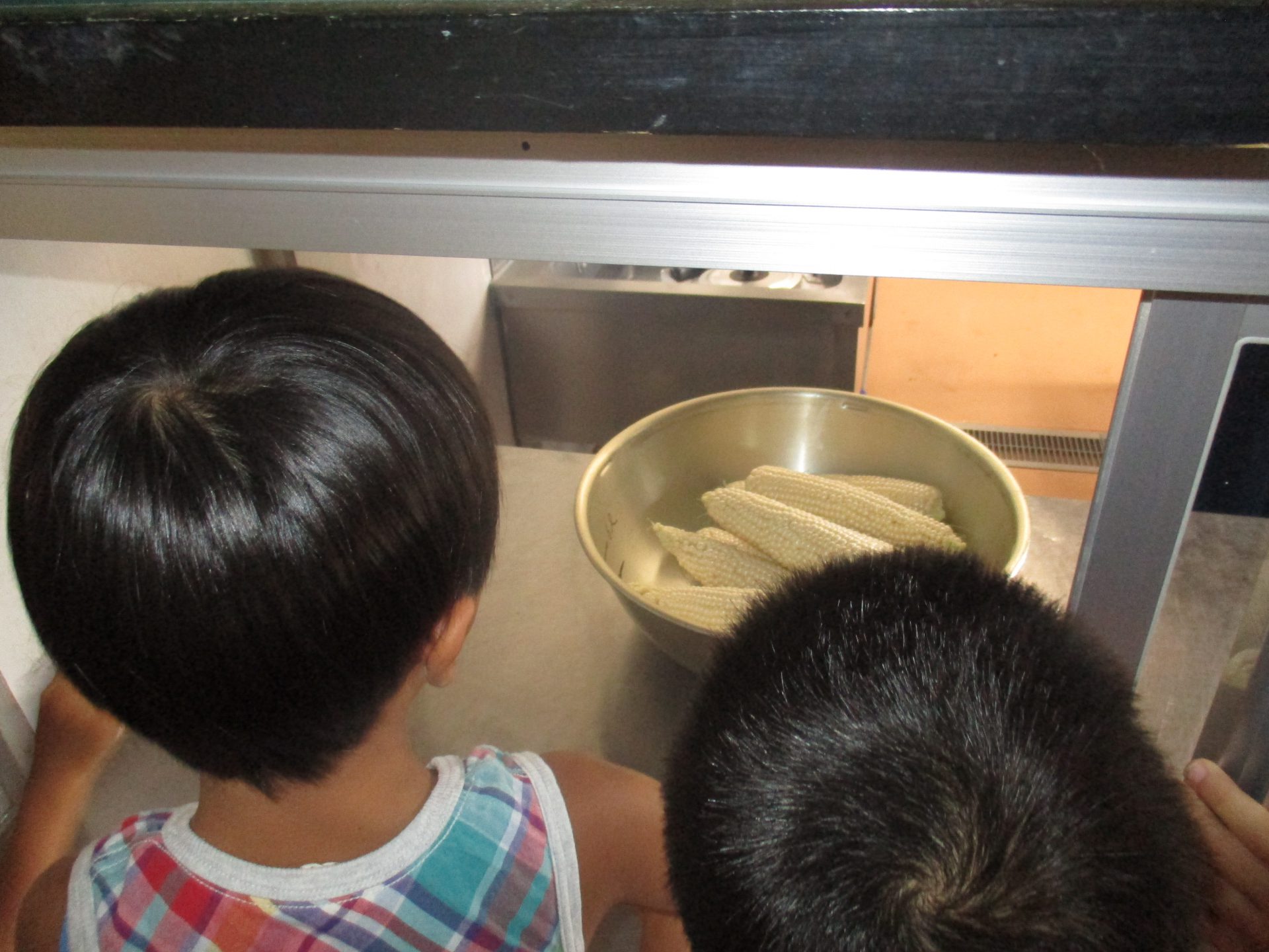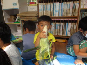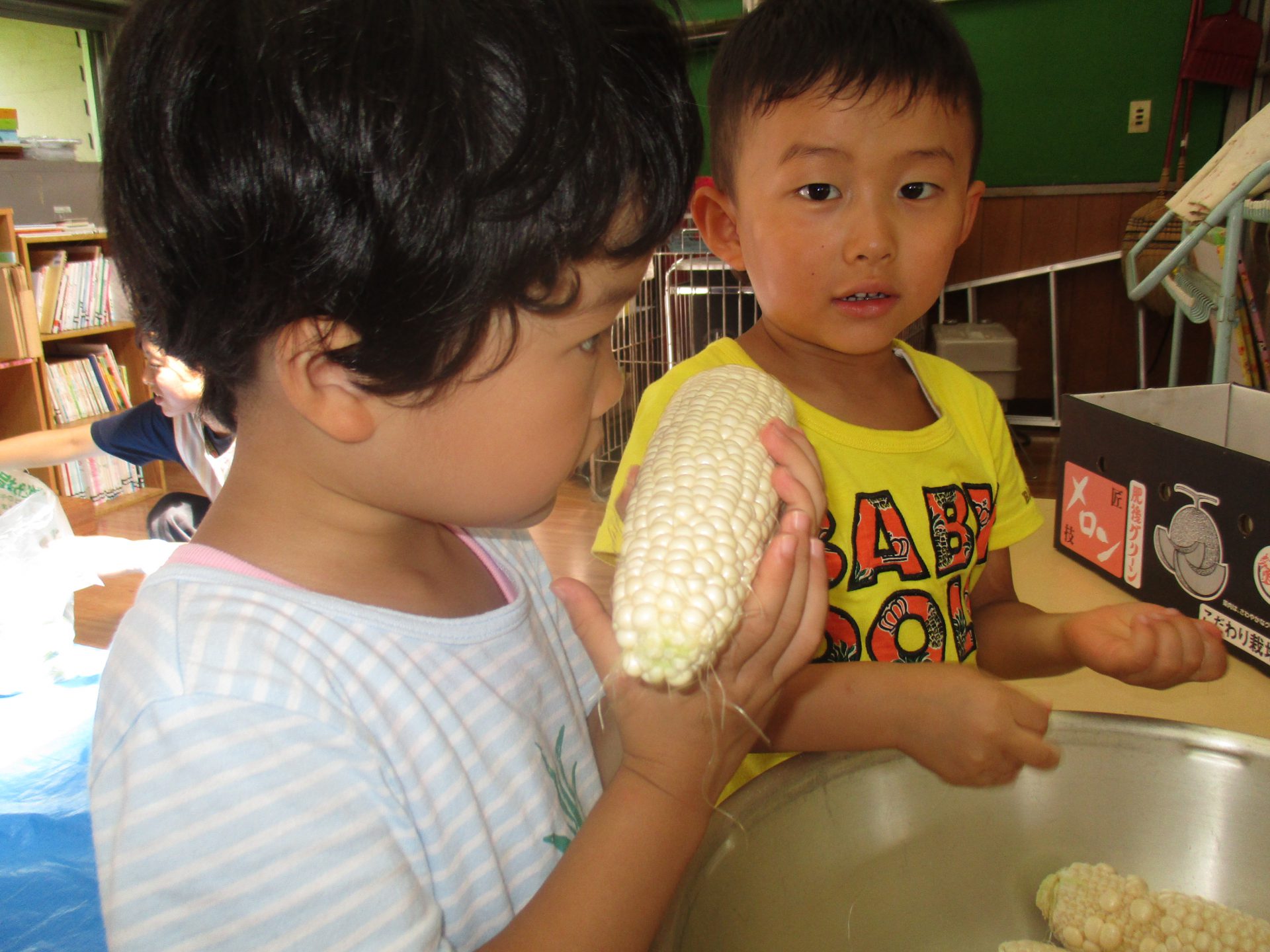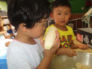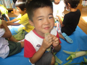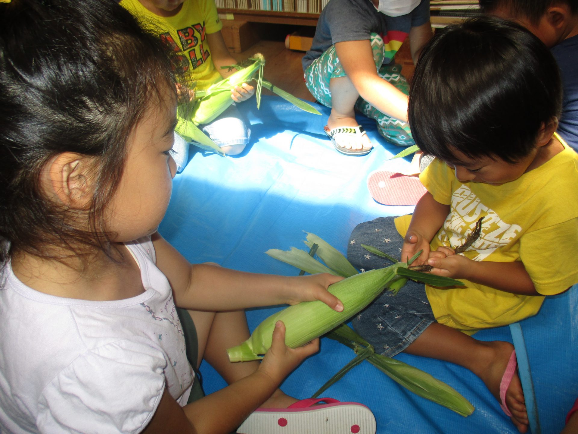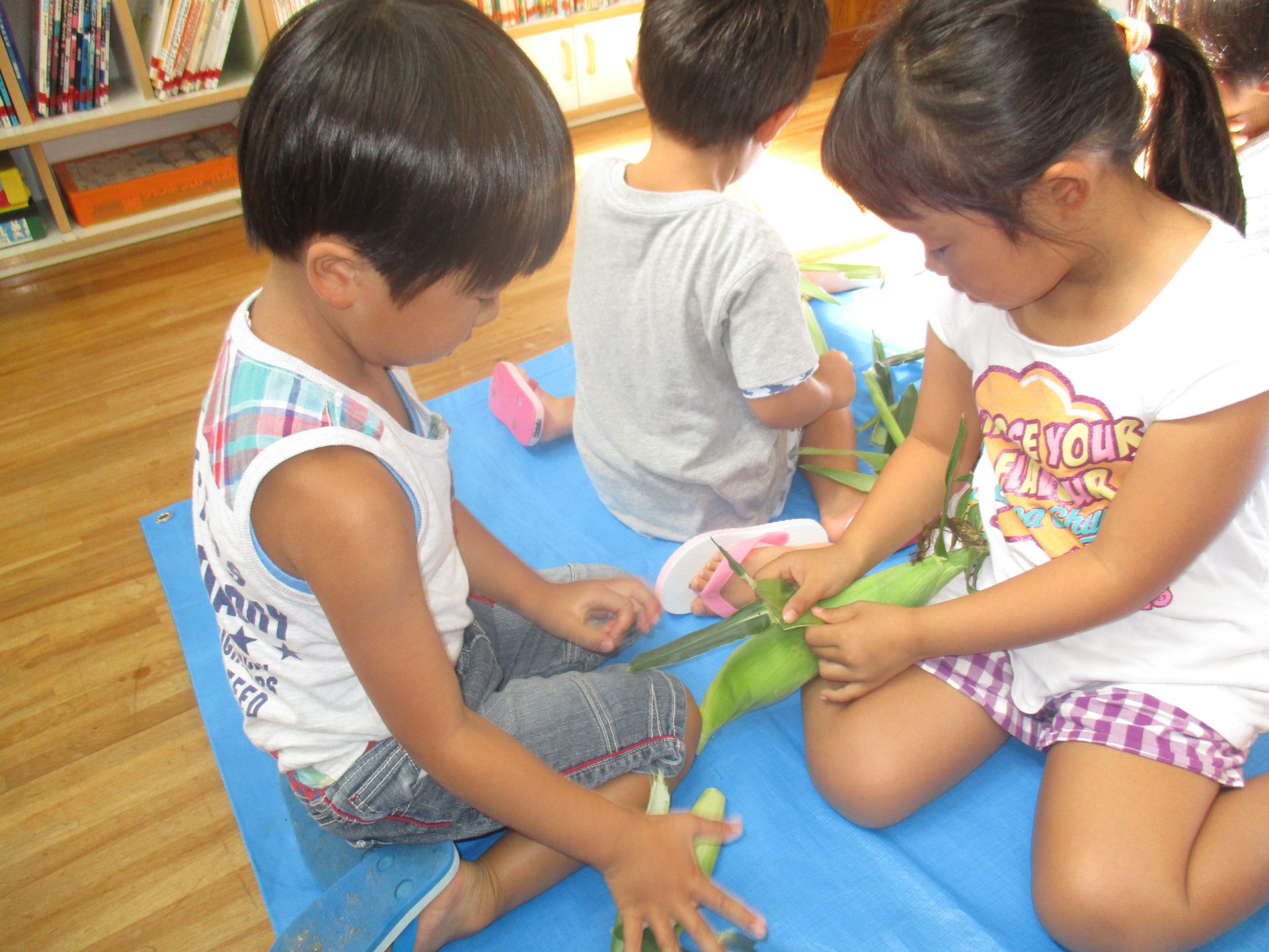 続いて・・・ おやつのとうもろこしの皮むきのお手伝いをみんなでやりました。
