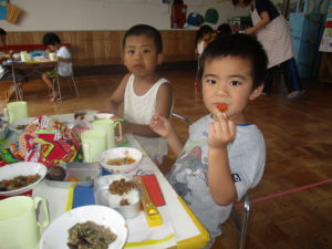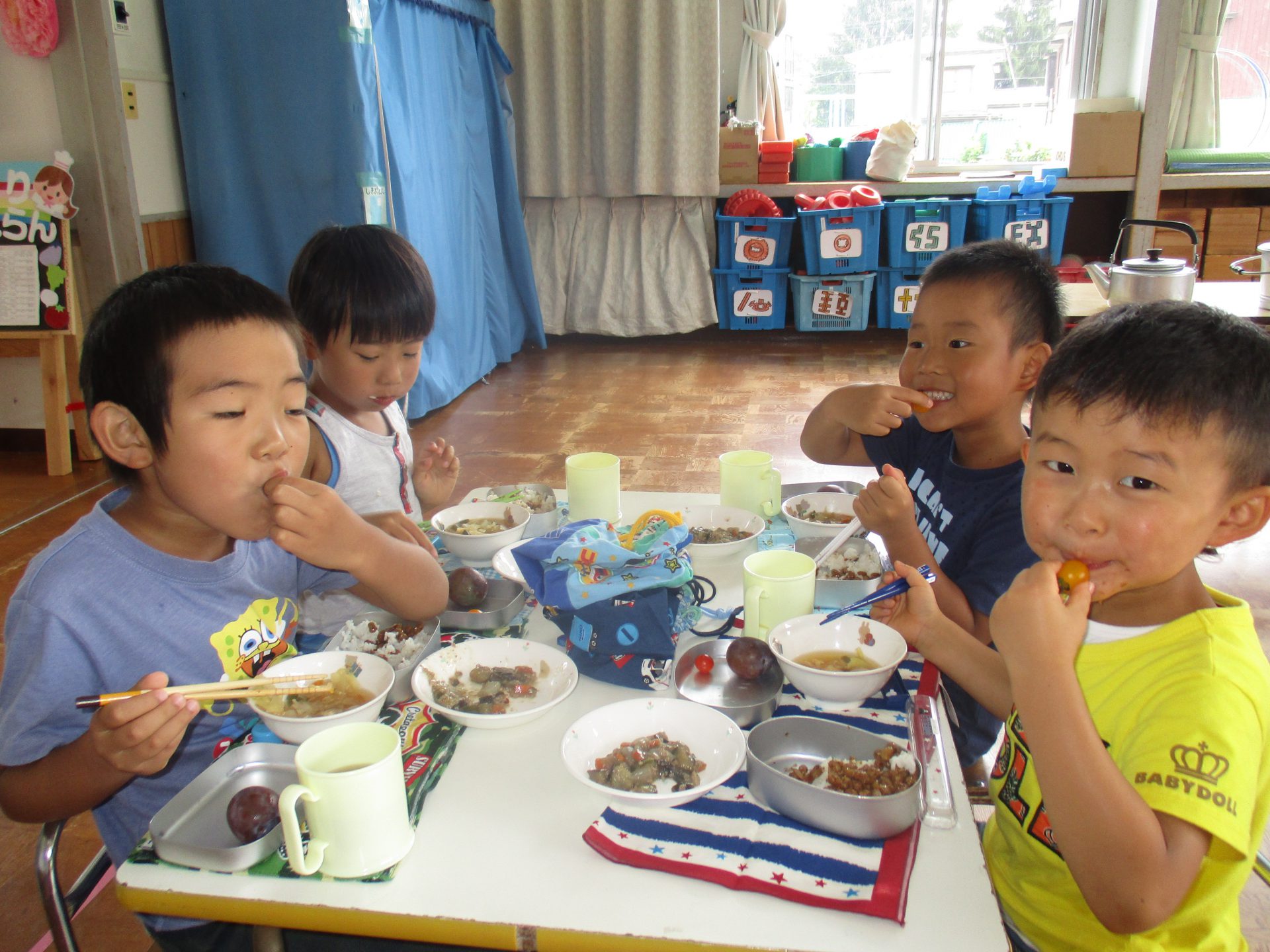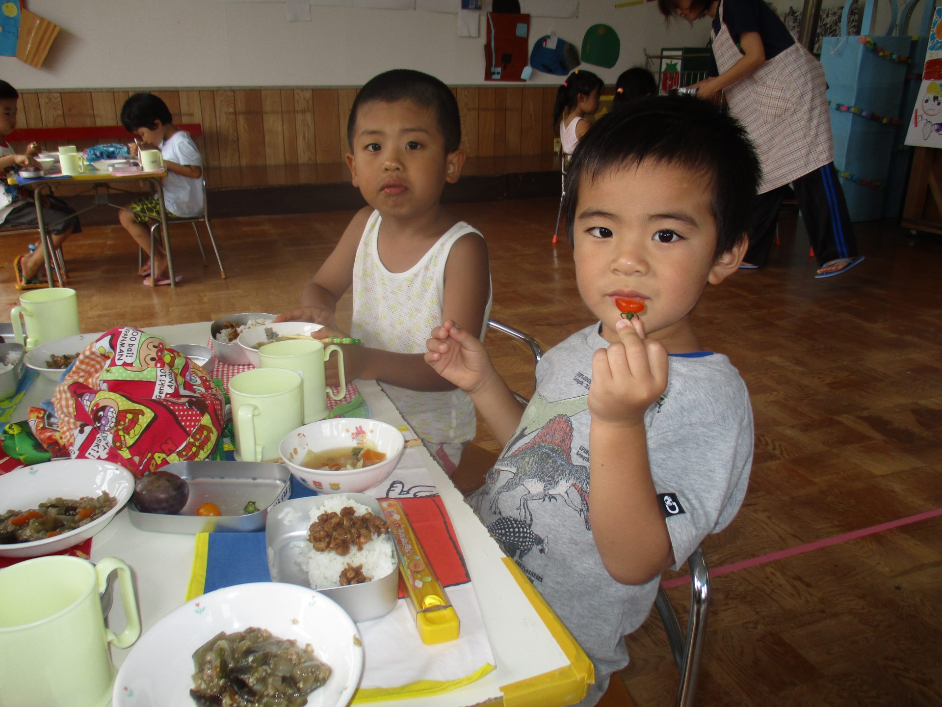 自分たちで収穫したり皮むきのお手伝いをした食材なので、より一層おいしく食べられたと思います。また、小さい保育園ならではの異年齢の関わりもいろんな場面で見られました。年長さんには経験したことを年下の子に教えてあげることで、自信を持って生活していってほしいと思います。これからも旬の食材の収穫やプールなど、この時期ならではの活動でも異年齢のふれ合いを大切にしていきたいと思います。