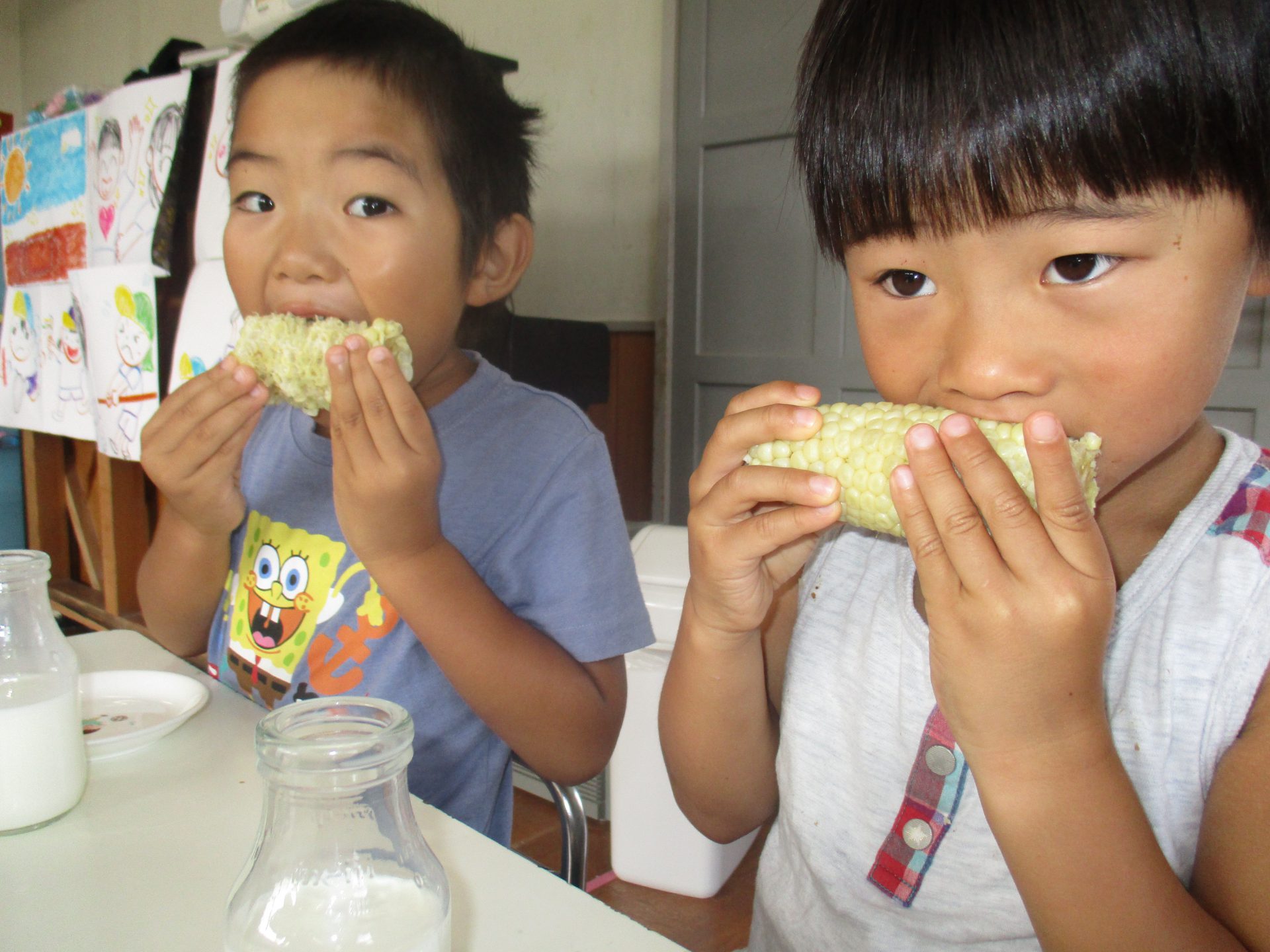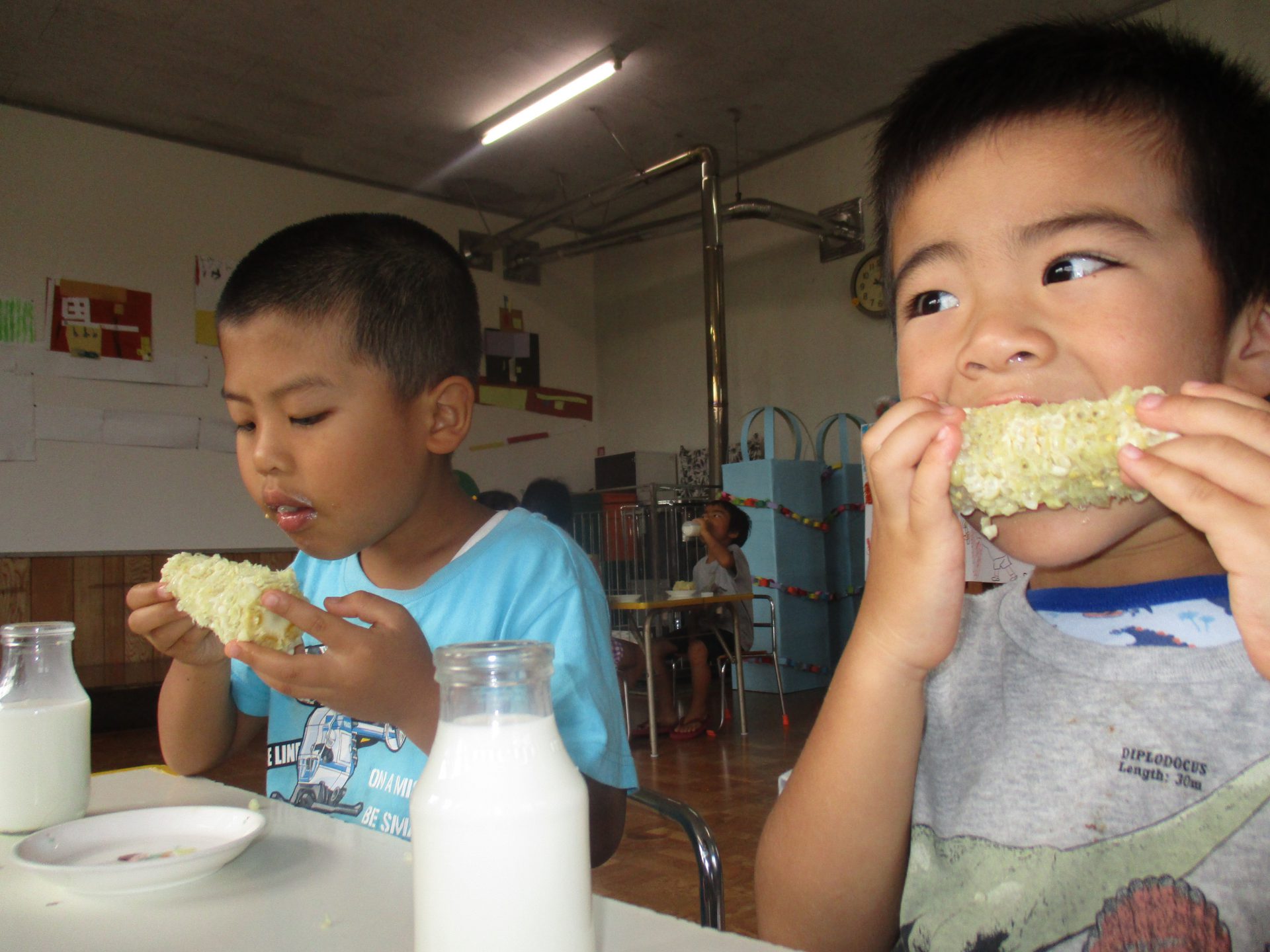 おやつには自分たちで皮を剥いたもろこしを頬張って、「前のより甘い!」「もっと食べたい!!」