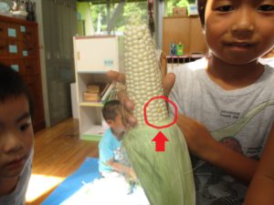 白いもろこしの粒の中に一粒だけ黄色い粒があるのを発見した子がいました!