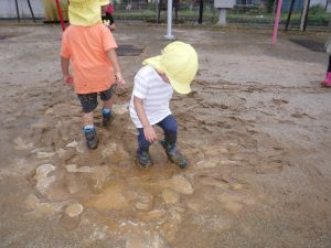 水たまりではゆっくり歩いてみたり、走ってみたり、水の飛ぶ様子を楽しんでいました。