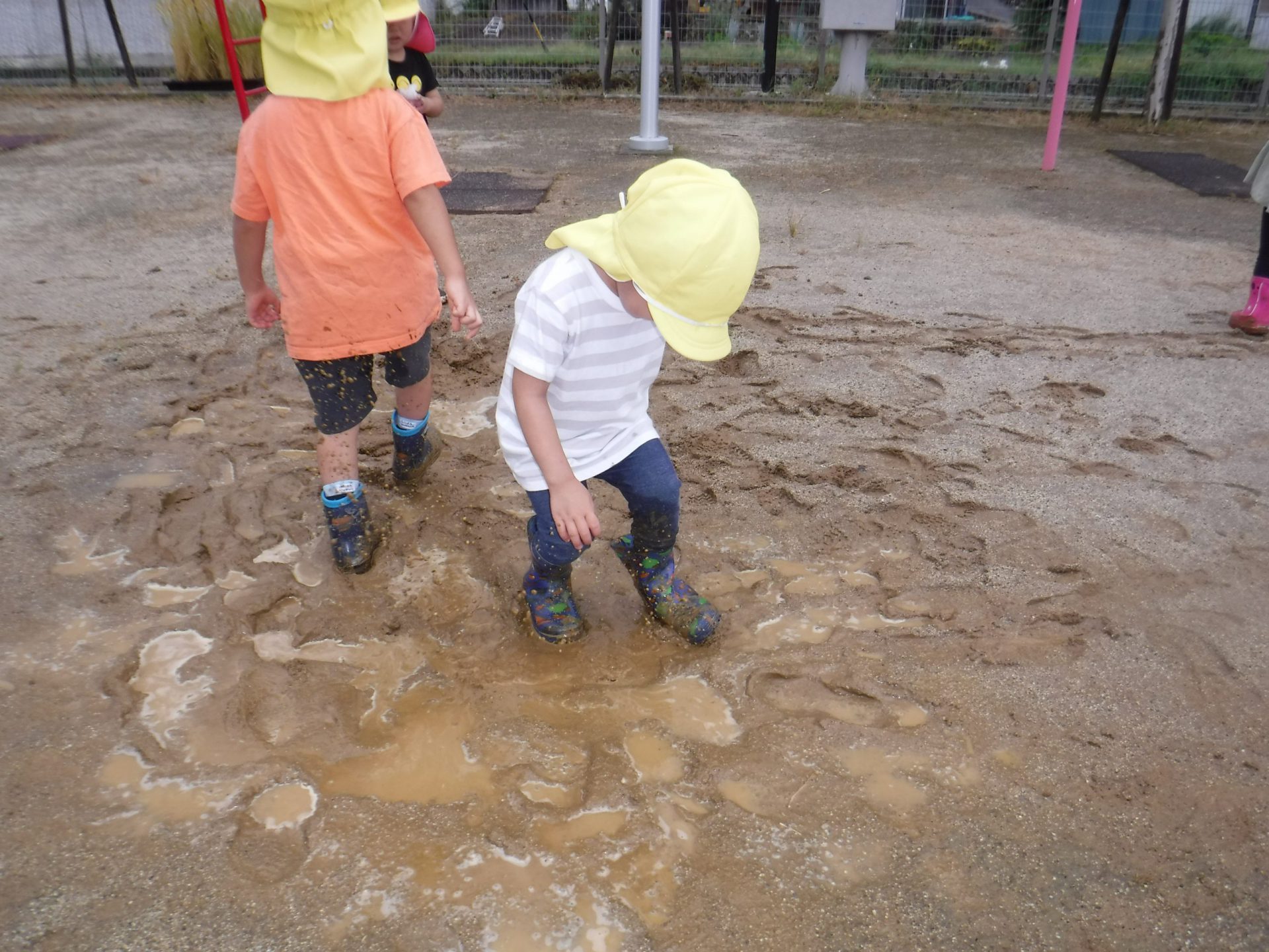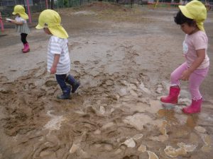 ヌルヌルしたりズボズボ足が入ったり、長靴に泥がくっついたりする感覚を楽しんでいました。