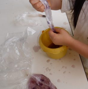 今度はビニール袋に花と水を入れてモミモミしてみます。