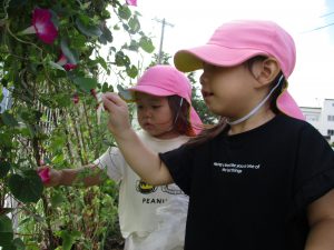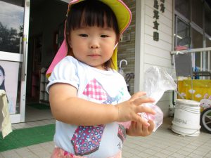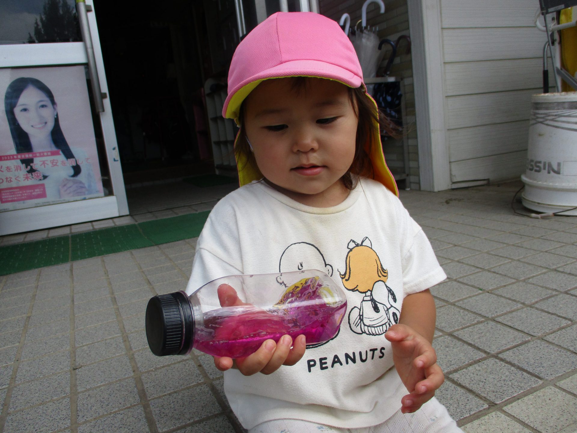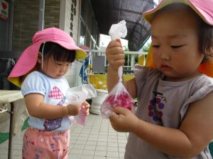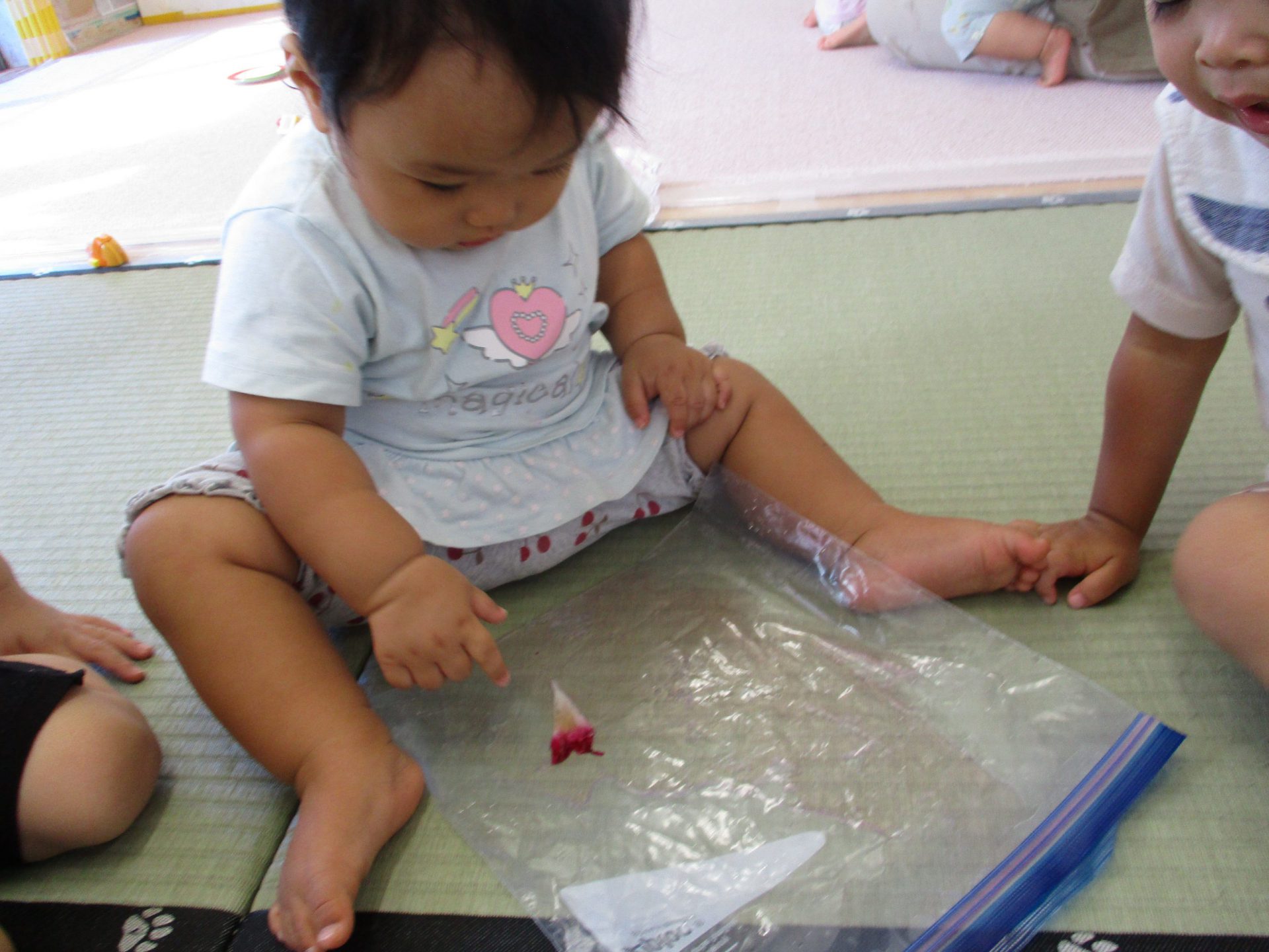 ・幼児組が色水を作って遊んでいるところをよく見ていたノンタン組の子どもたち。ビニール袋を渡すと使い方を知っているかのように朝顔に向かっていく姿に保育士も驚きました。最近は周りの子がしている遊びや保育士のしていることに興味深々な姿も増えてきています。遊びを通して興味をもったことを「やってみることができる」環境作りをこれからも大切にしていきたいと思いました。