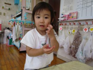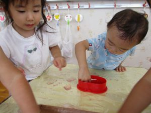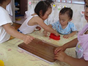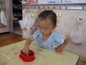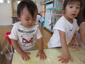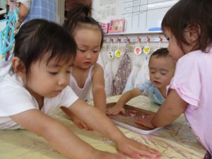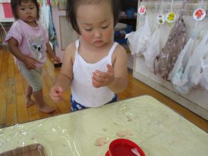・最近は友達が使っているおもちゃや友達のしていること等、何かと友達のことが気になるノンタン組の子どもたち。初めての感触遊びに戸惑う子も、友達が楽しんでいる姿を見て同じことをやってみようとする姿がありました。保育士だけが準備する遊びの環境以外にも、子どもたち同士がお互いに影響しあう環境も近くで見守りながら大切にしていきたいと思いました。