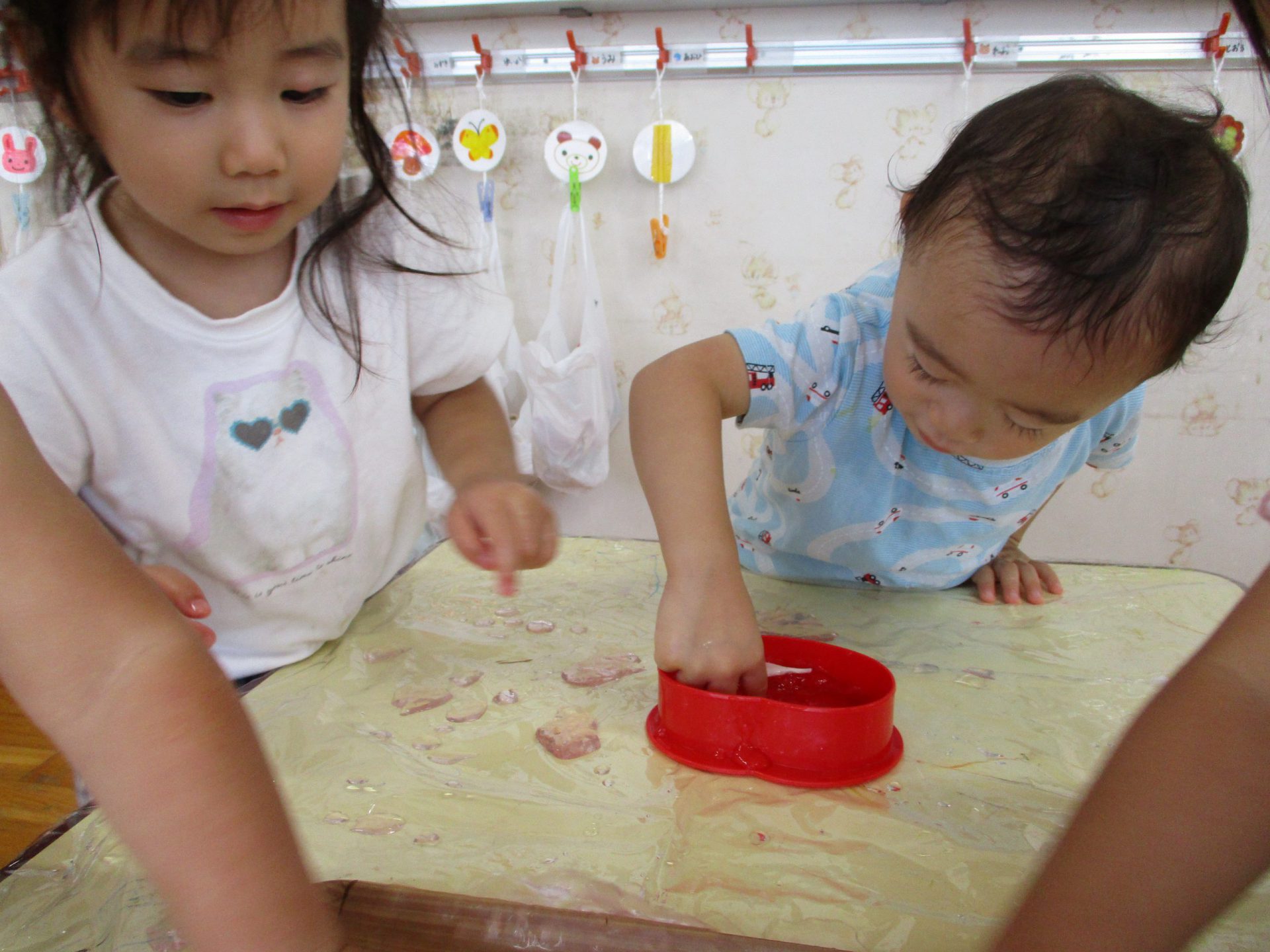 みんなで作った色水を寒天で固めて感触を楽しみました。