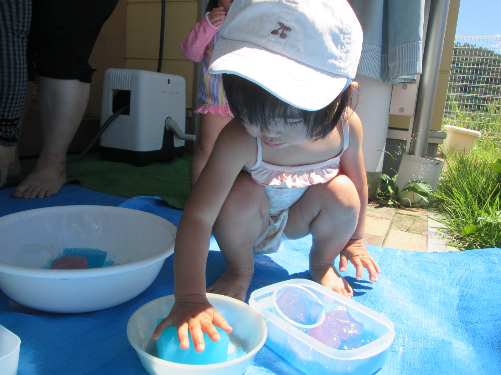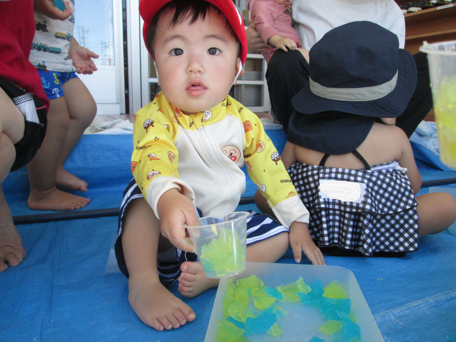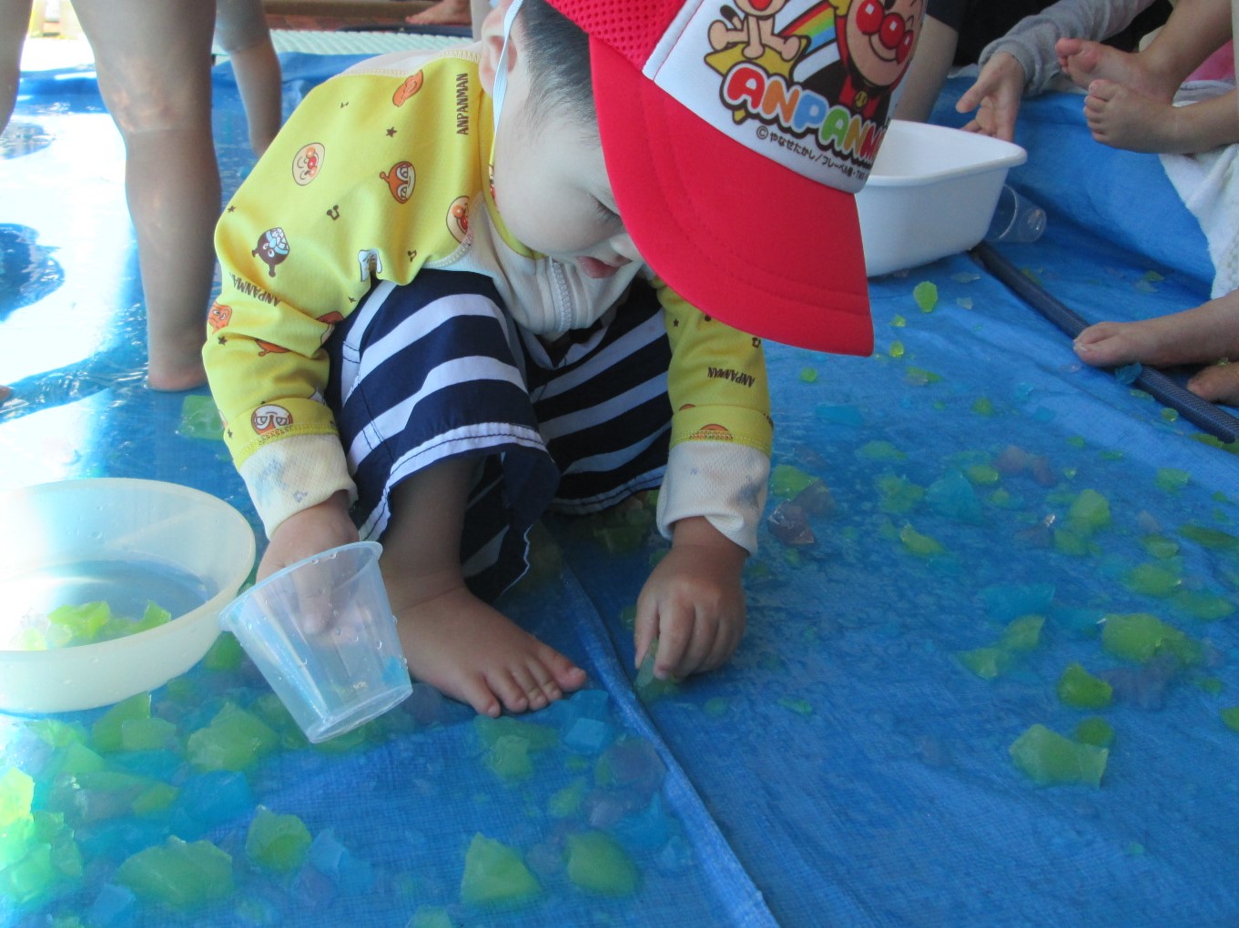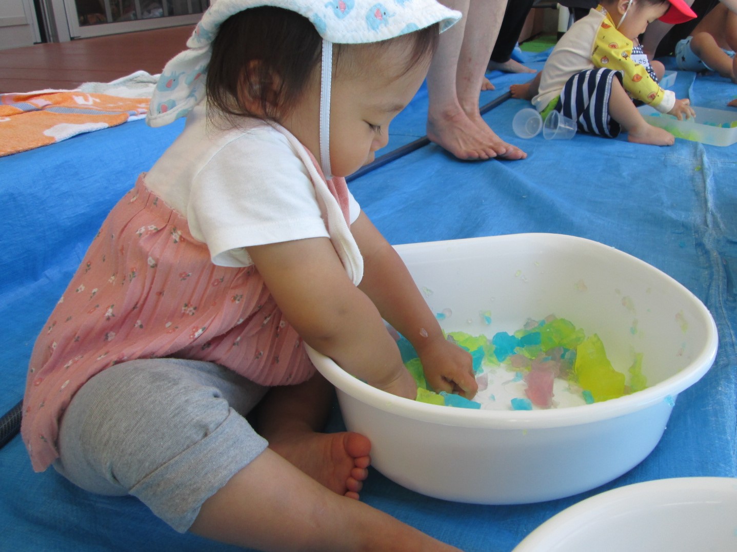 水あそびに慣れてきた頃、いろいろな感触に触れ楽しんでほしいという思いから寒天あそびをしました。
