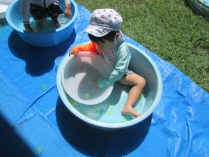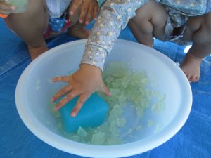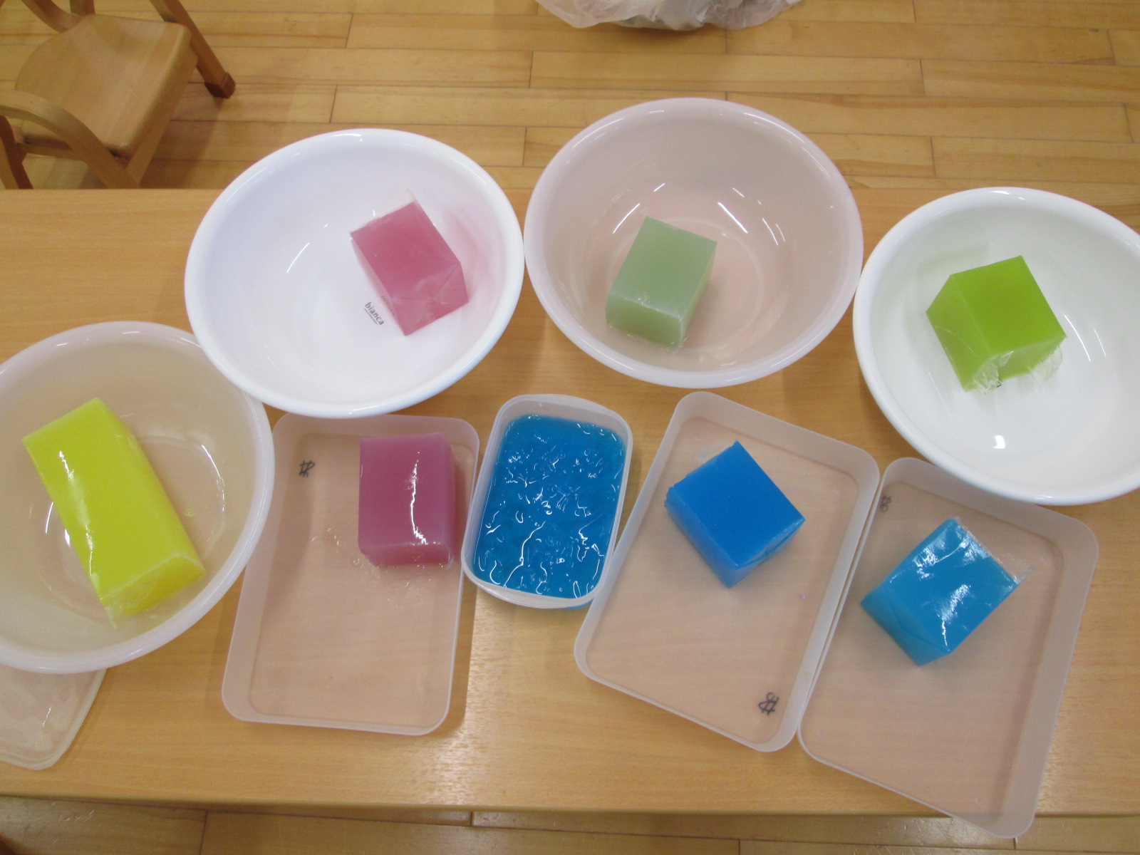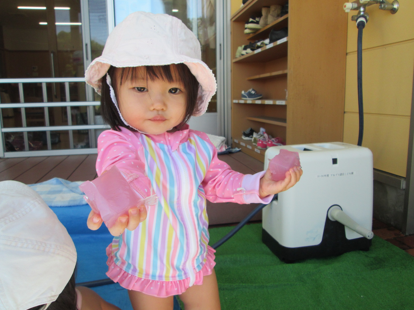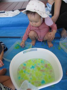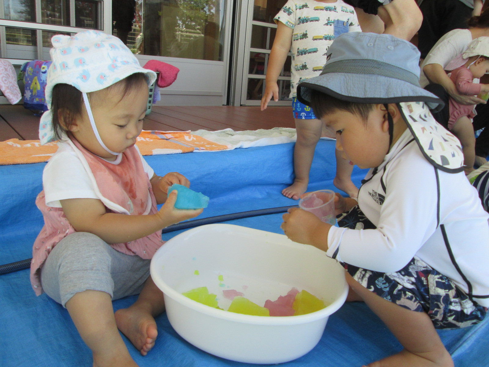 水あそびに慣れてきた頃、いろいろな感触に触れ楽しんでほしいという思いから寒天あそびをしました。