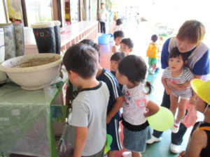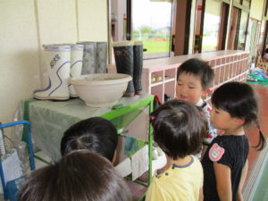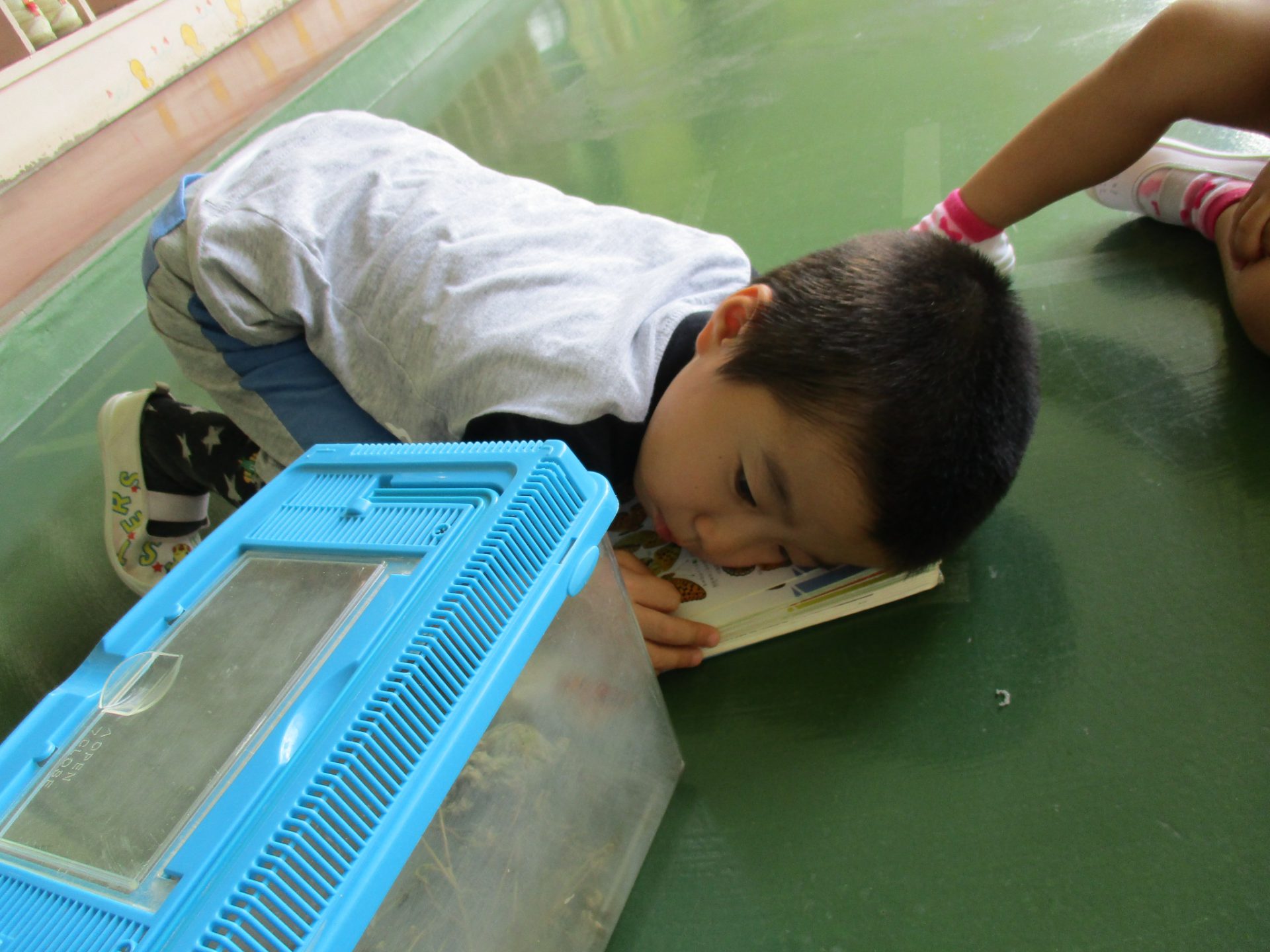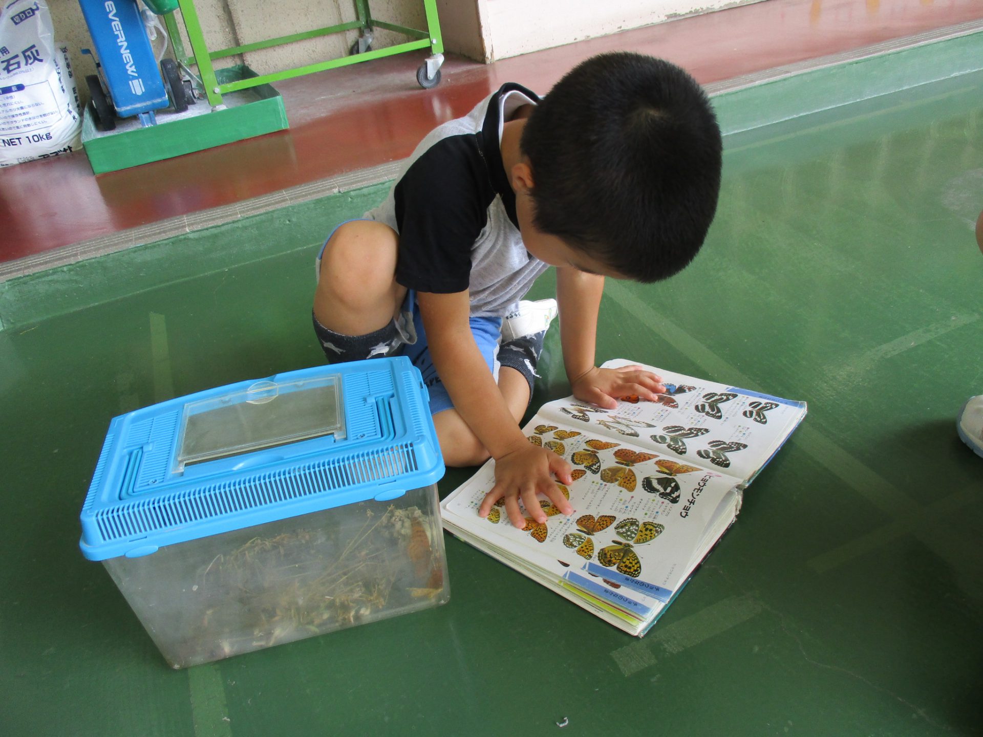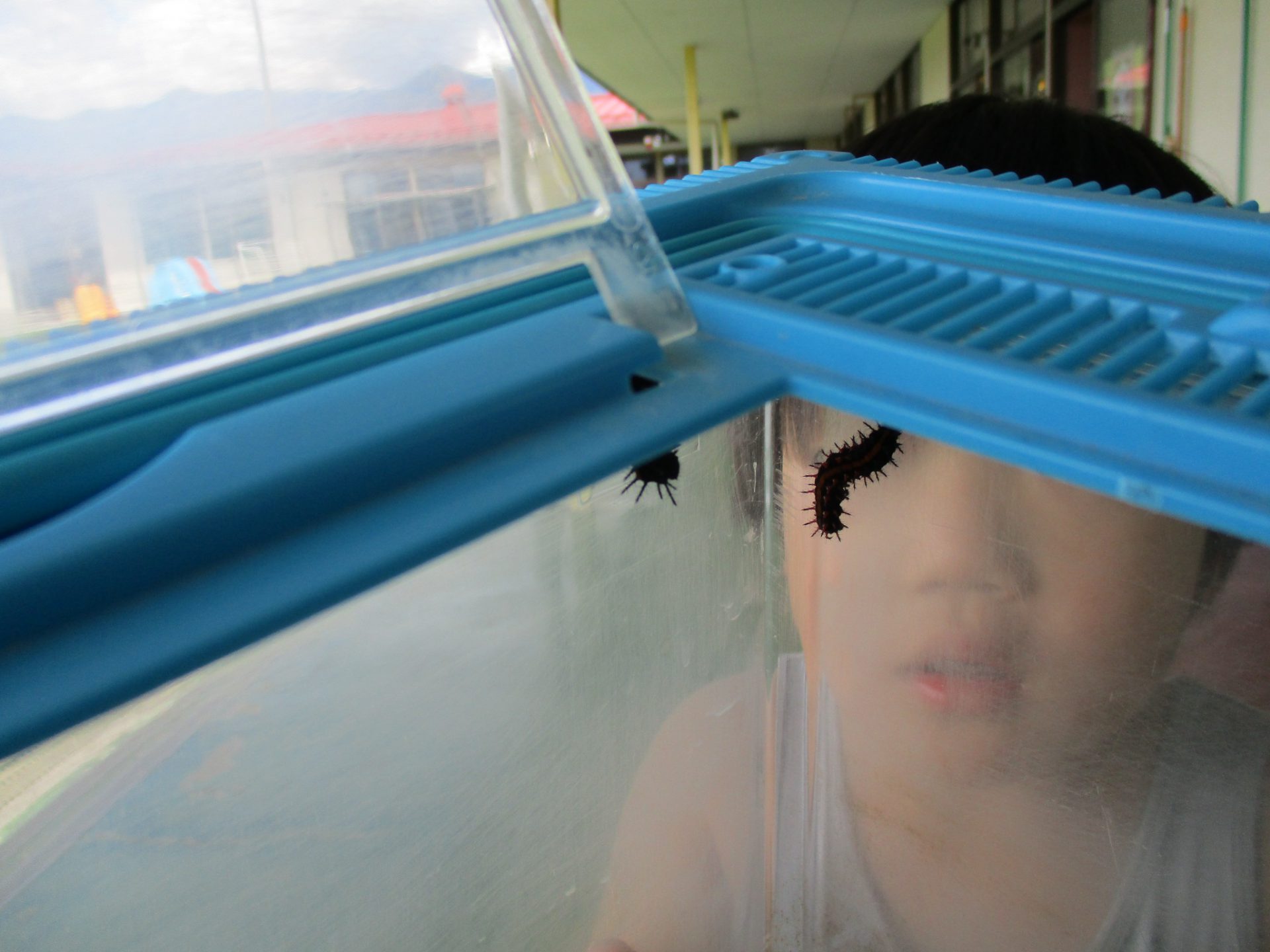 黒くて綺麗な赤い線のある奇妙な毛虫に興味深々!・・・これかな?あれかな?と図鑑片手に観察が始まり、毎日楽しみに飼育ケースをのぞき込んでいる年中組です。