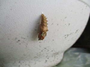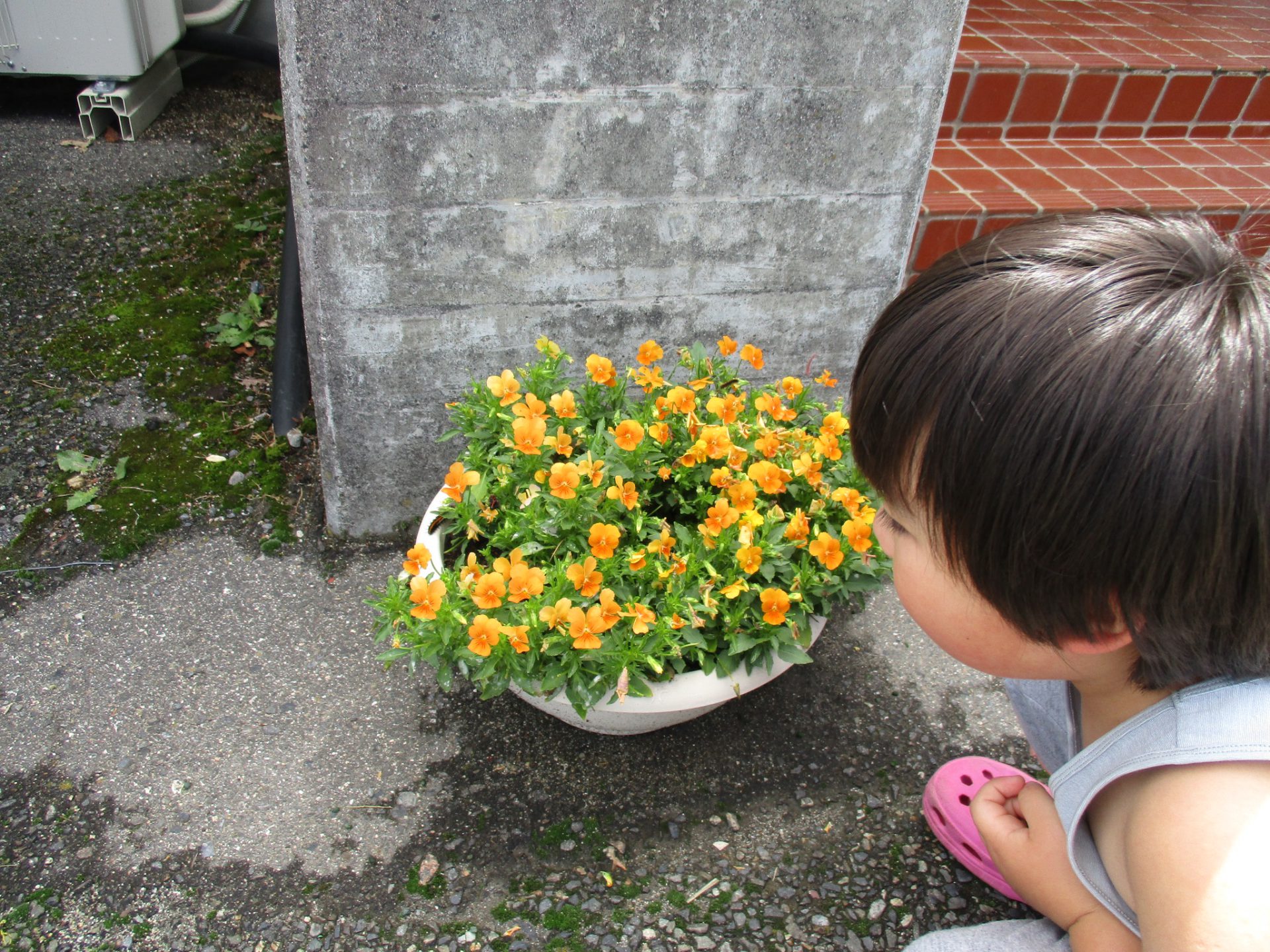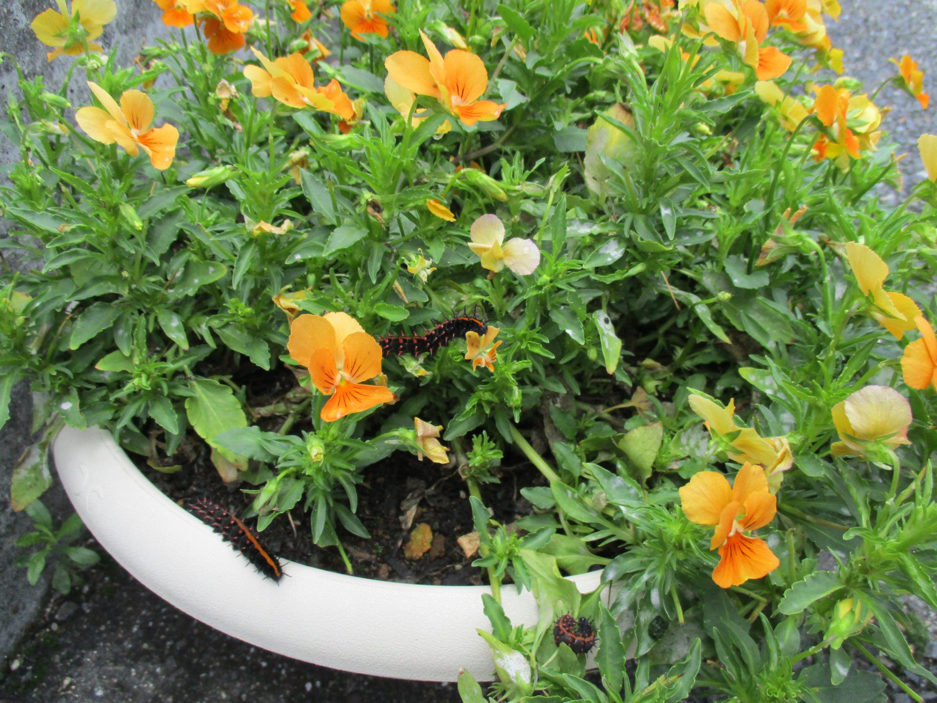 「ん~ここに(毛虫)いっぱいいるから(ビオラ)この葉っぱ食べるかもよ」